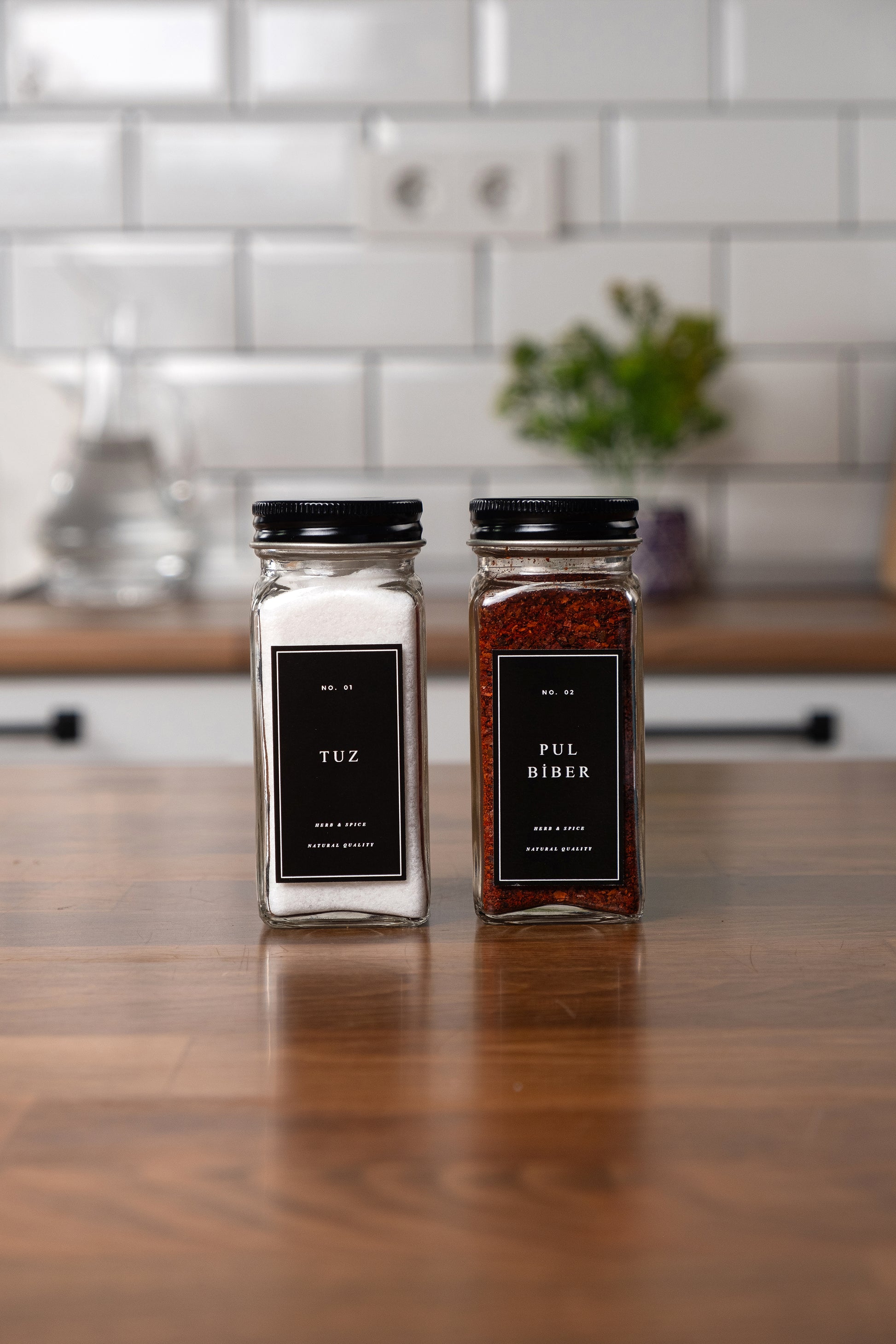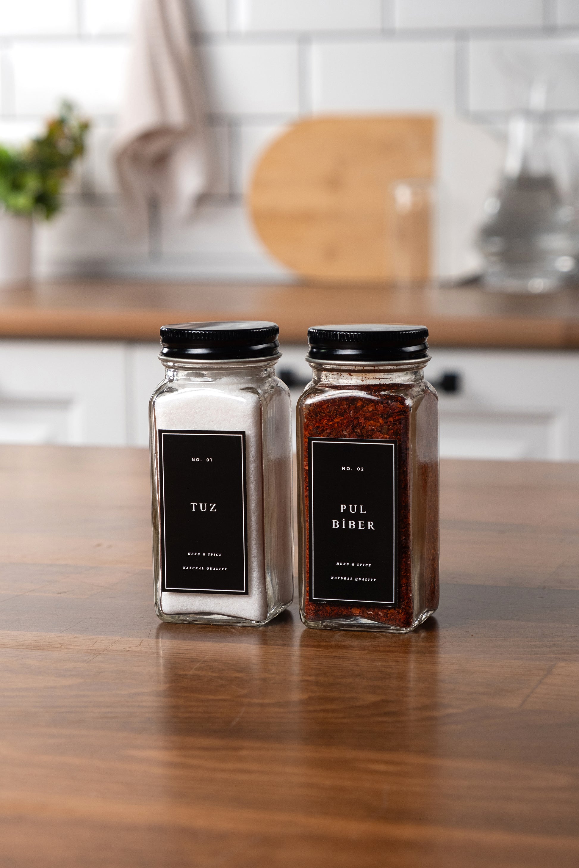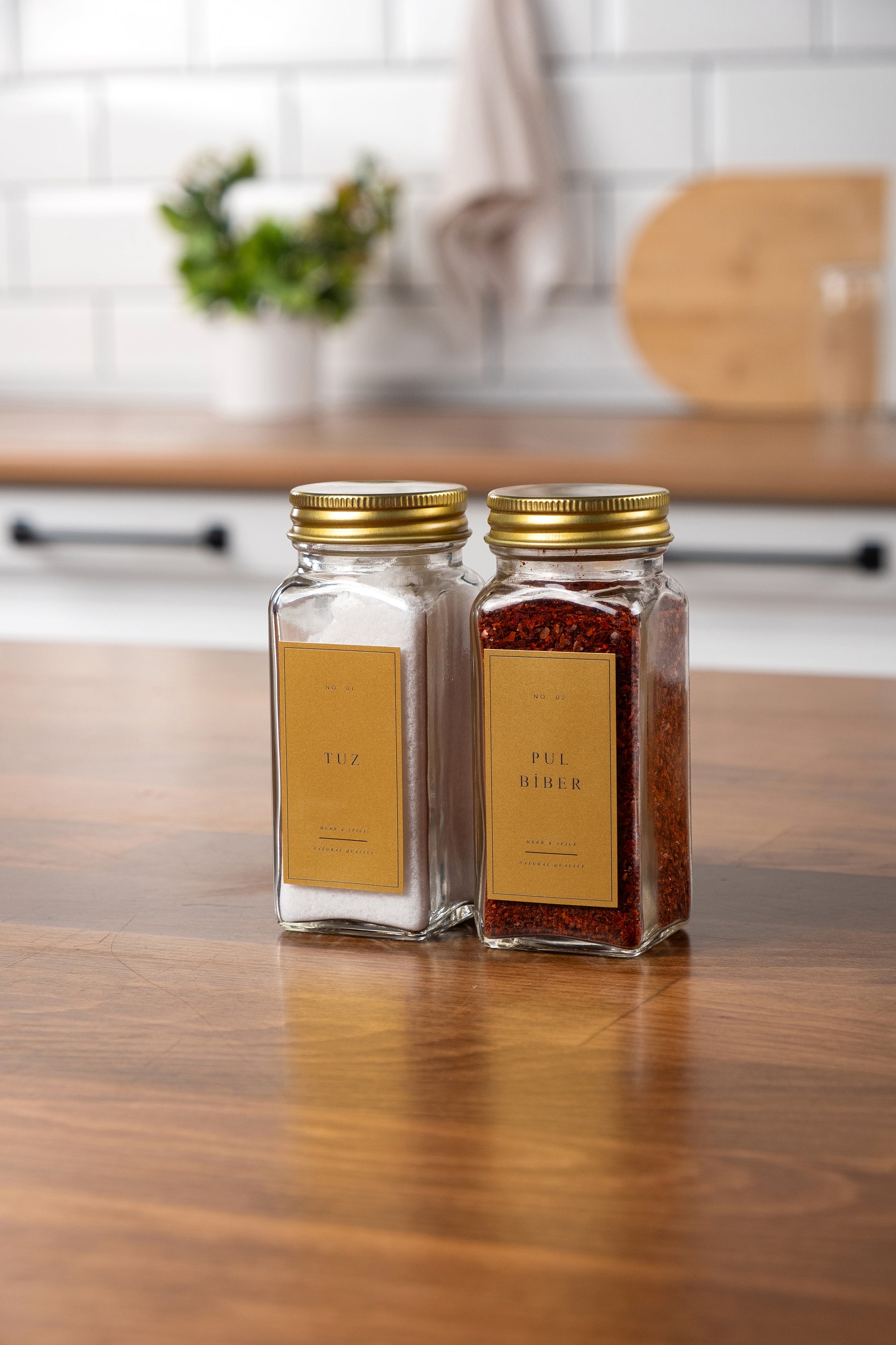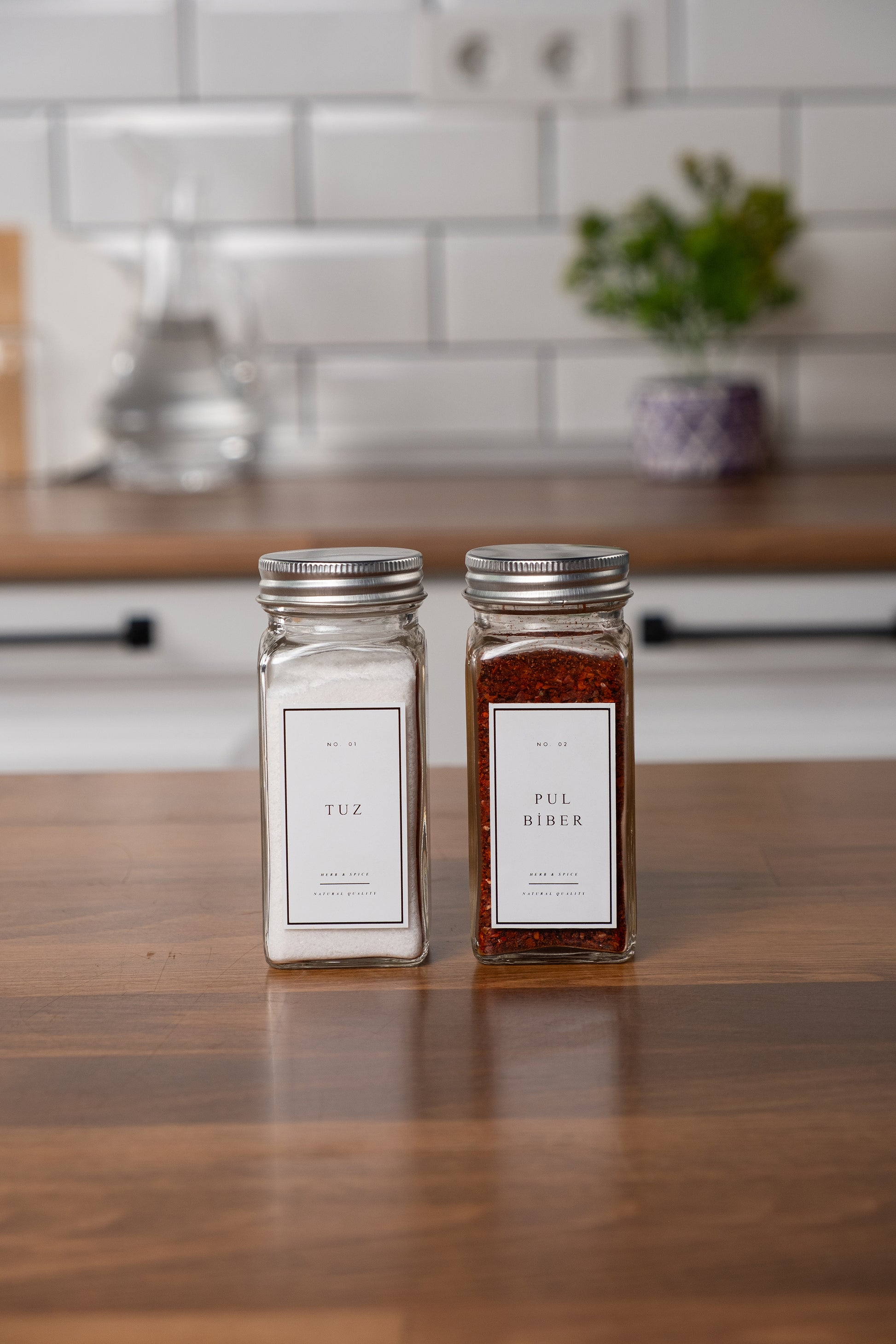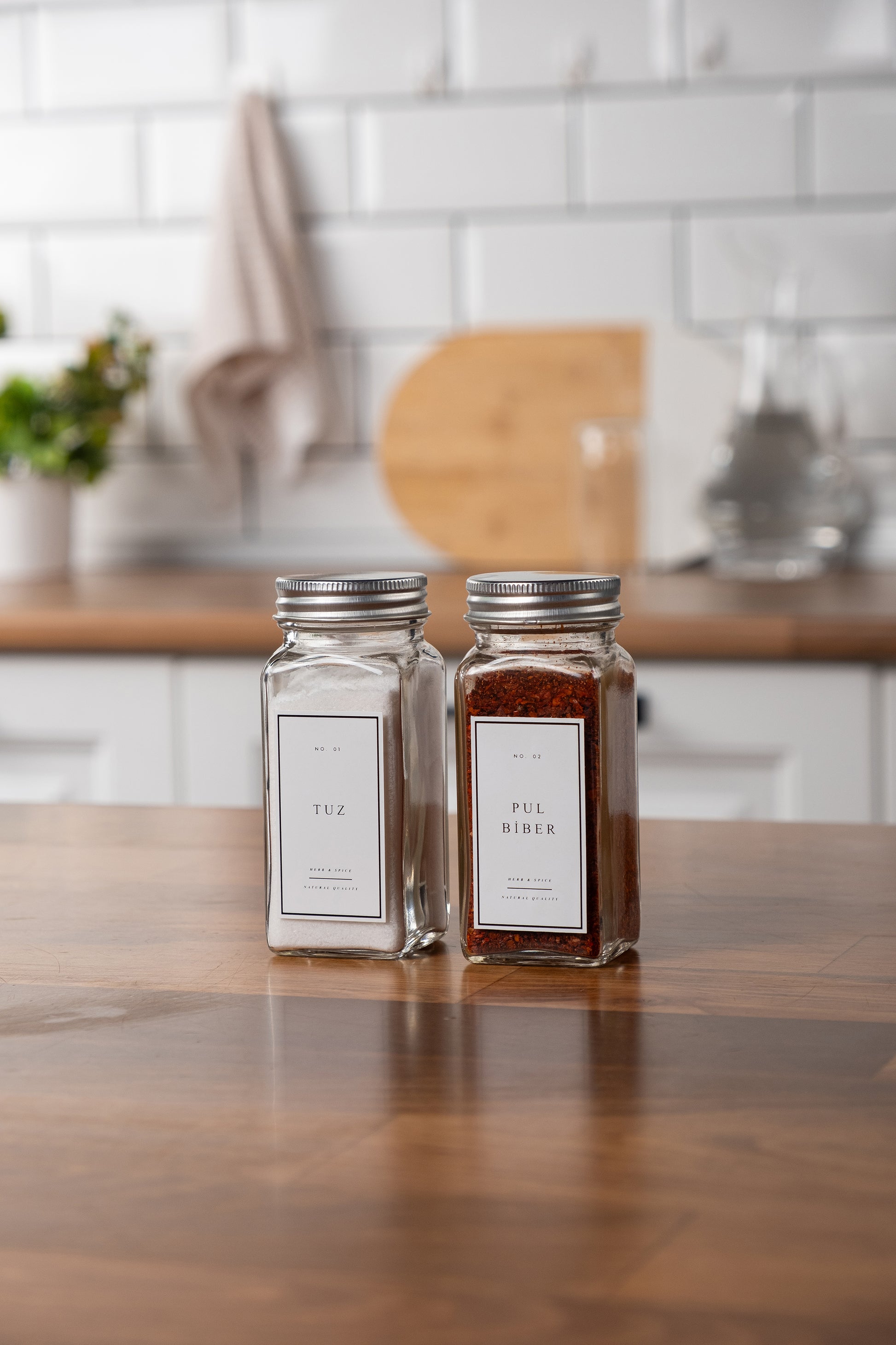 Paket İçeriği; 2 adet Baharatlık, 2 adet iç kapak, 2 adet dış kapak, 6 adet sudan etkilenmez etiket.