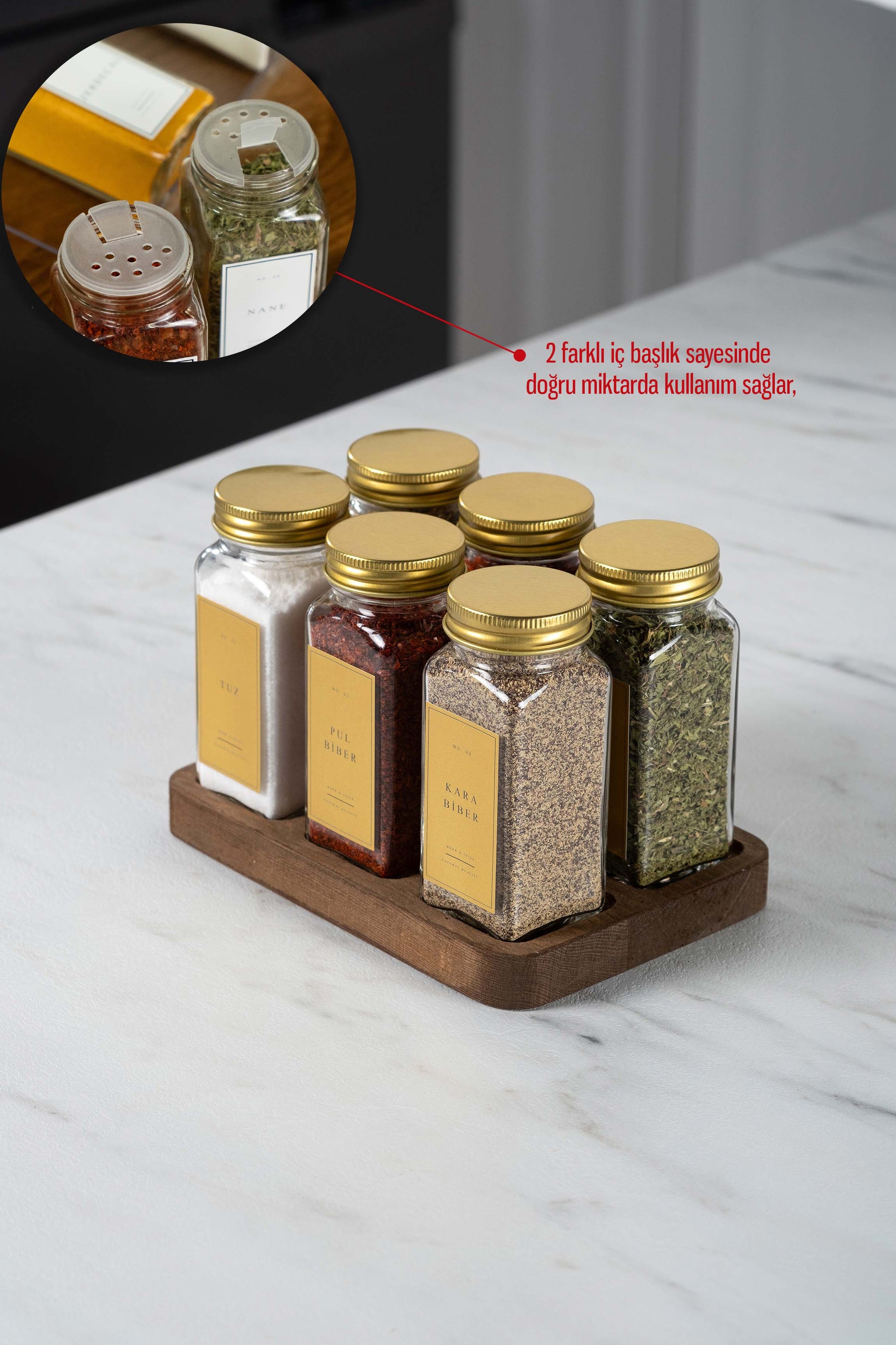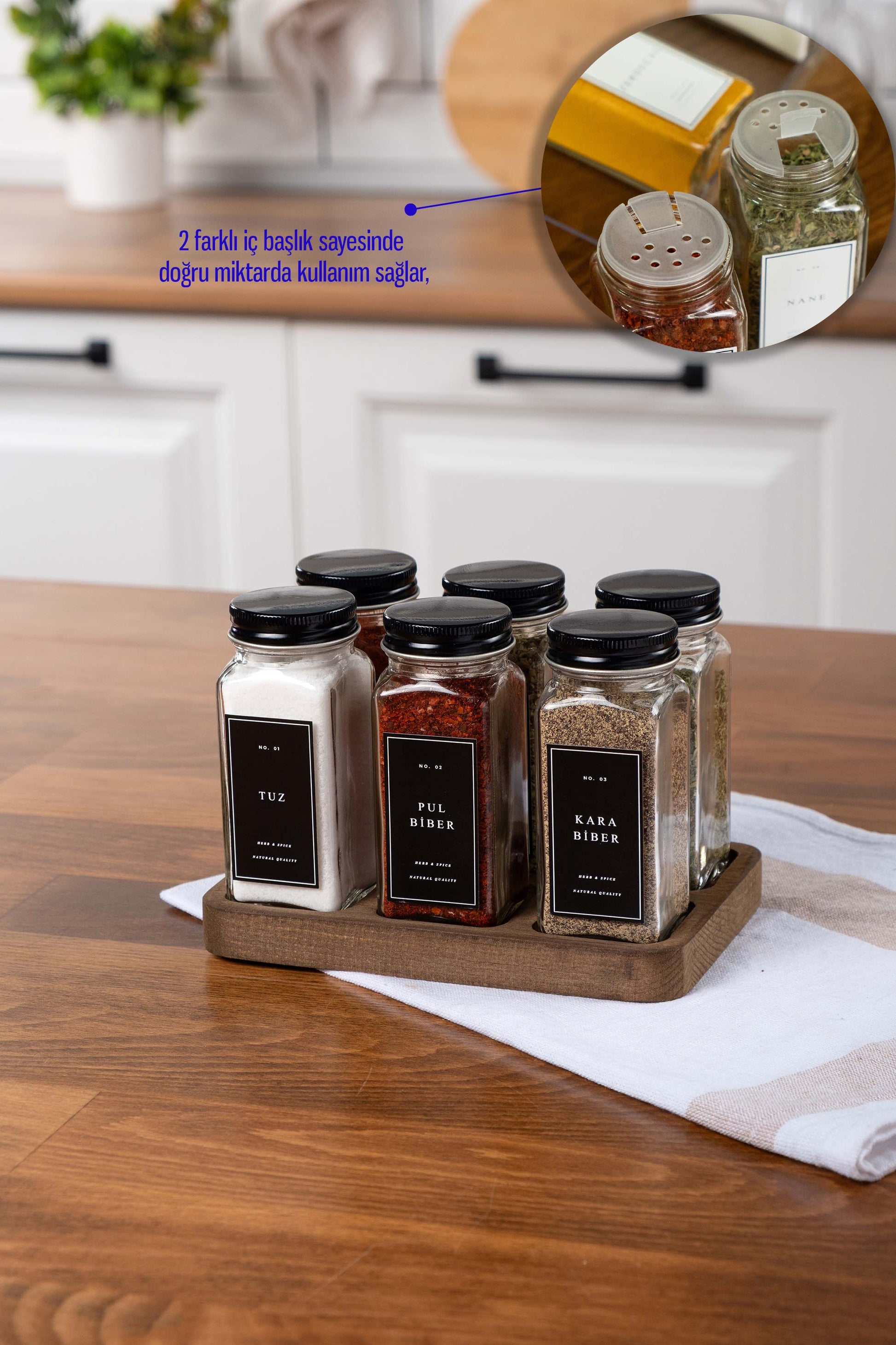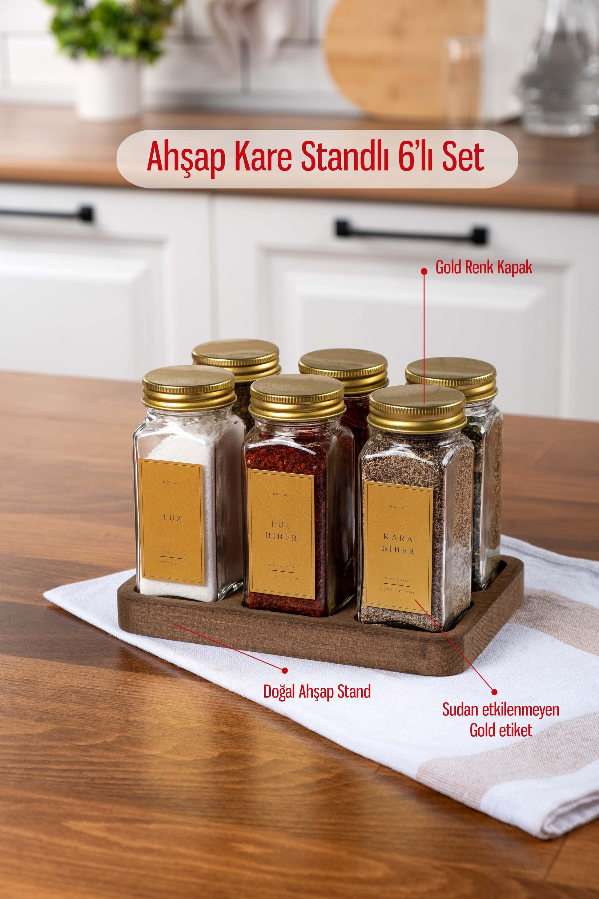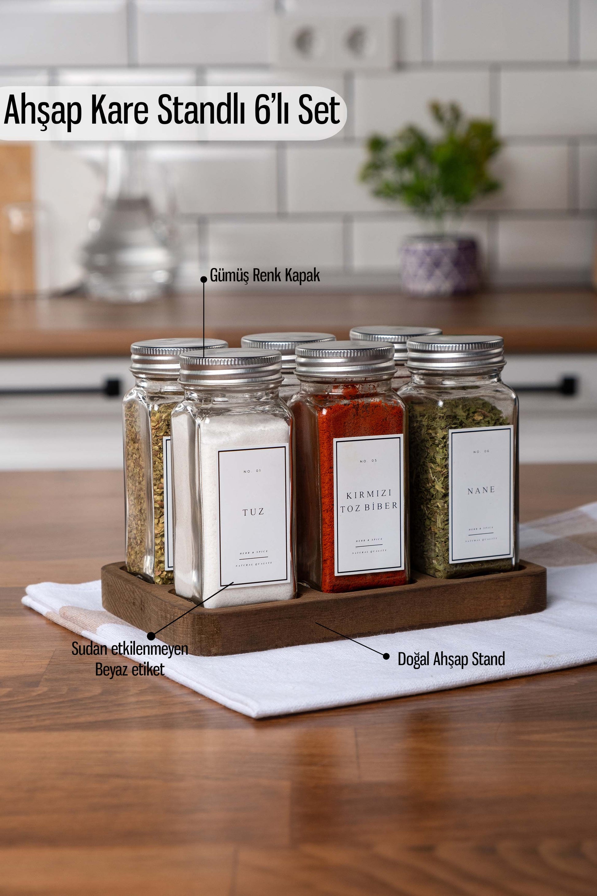 Paket İçeriği; 6 adet Baharatlık, 6 adet iç kapak, 6 adet dış kapak, 12 adet sudan etkilenmez etiket, 1 adet 6'lı ahşap stant.