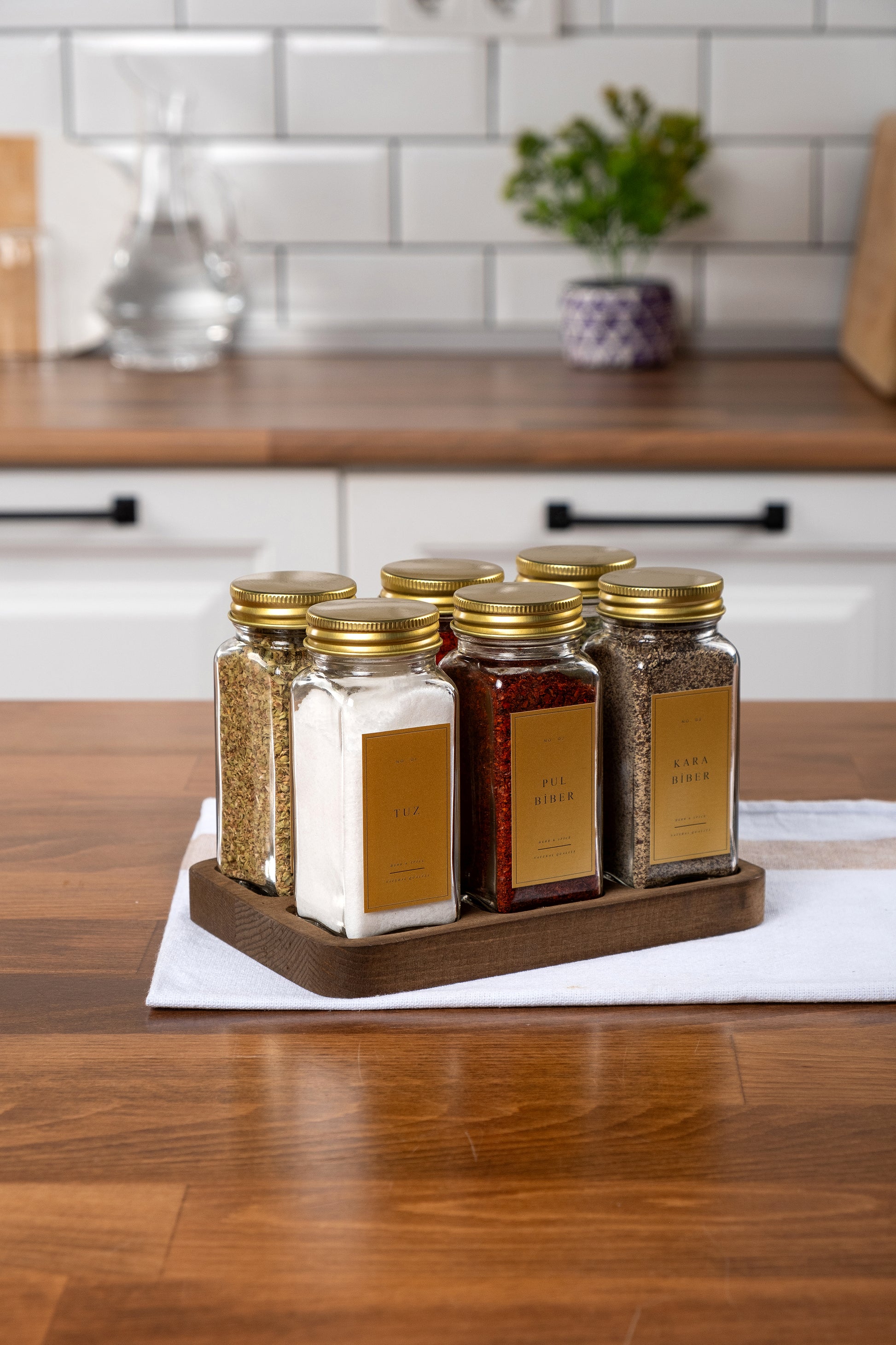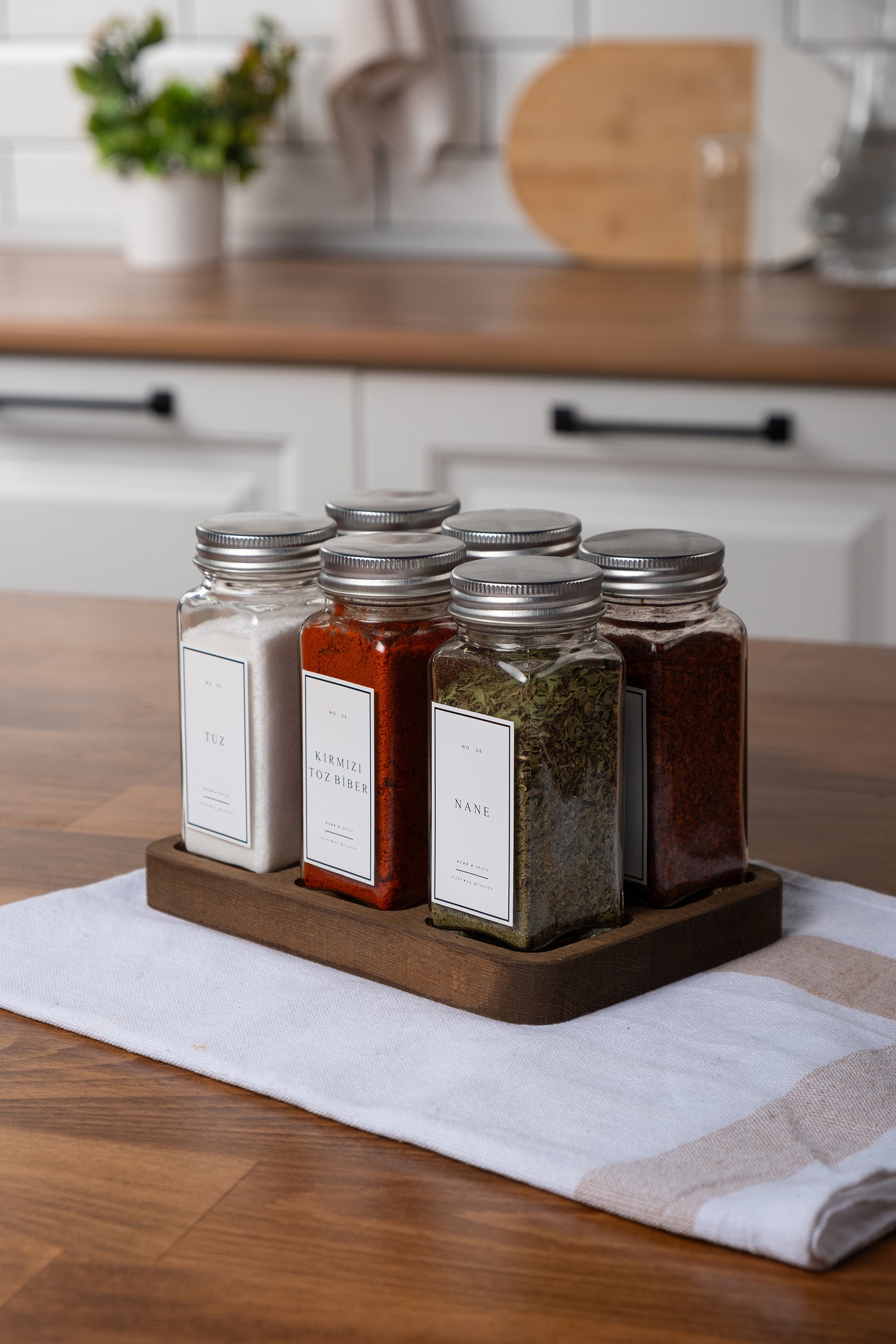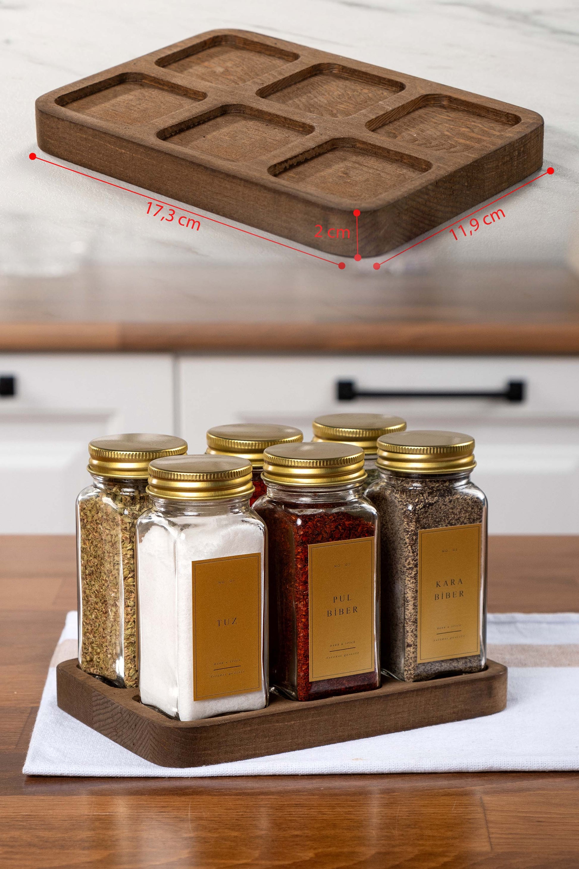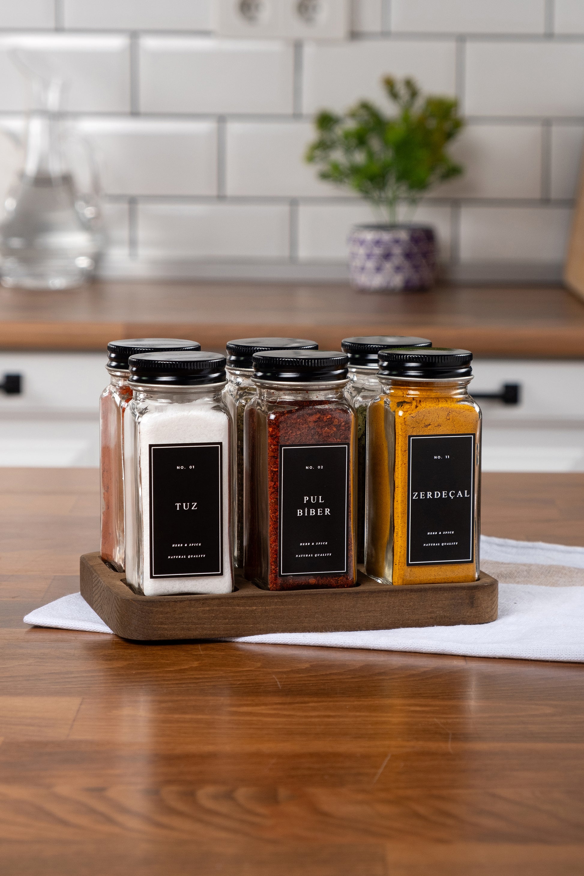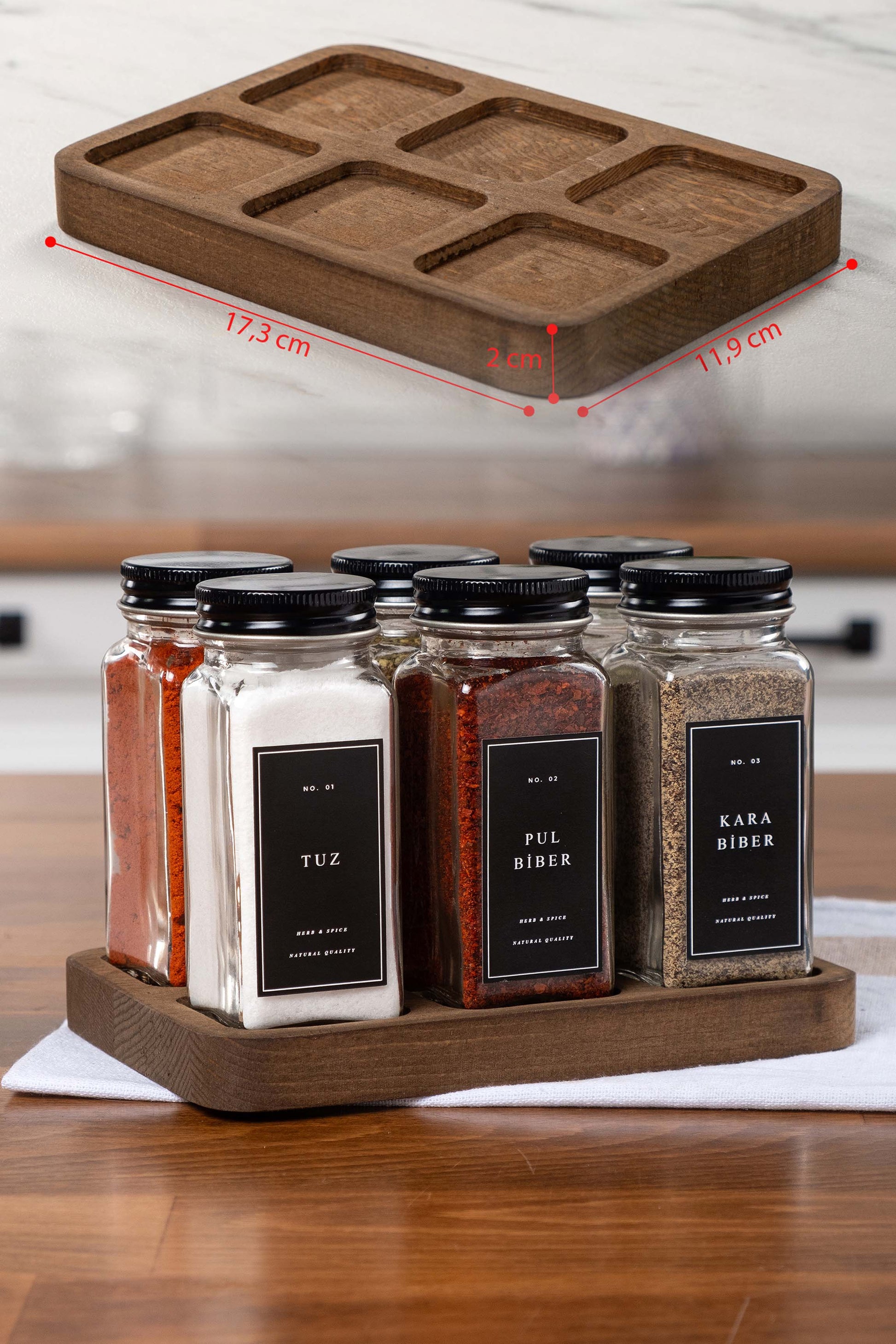 Paket İçeriği; 6 adet Baharatlık, 6 adet iç kapak, 6 adet dış kapak, 12 adet sudan etkilenmez etiket, 1 adet 6'lı ahşap stant.