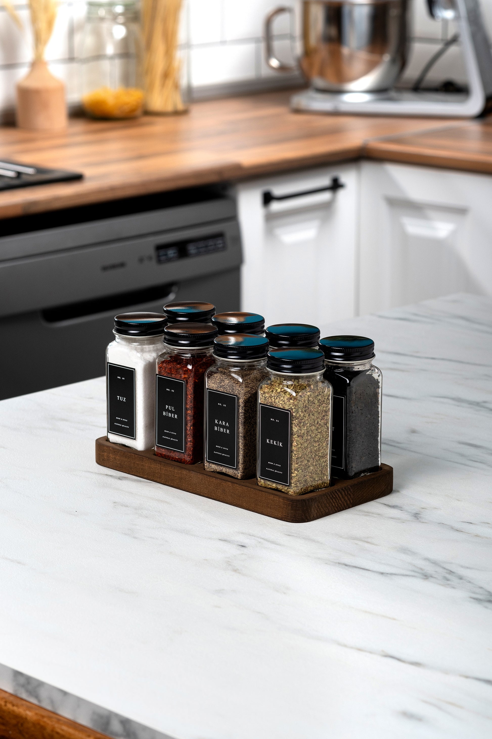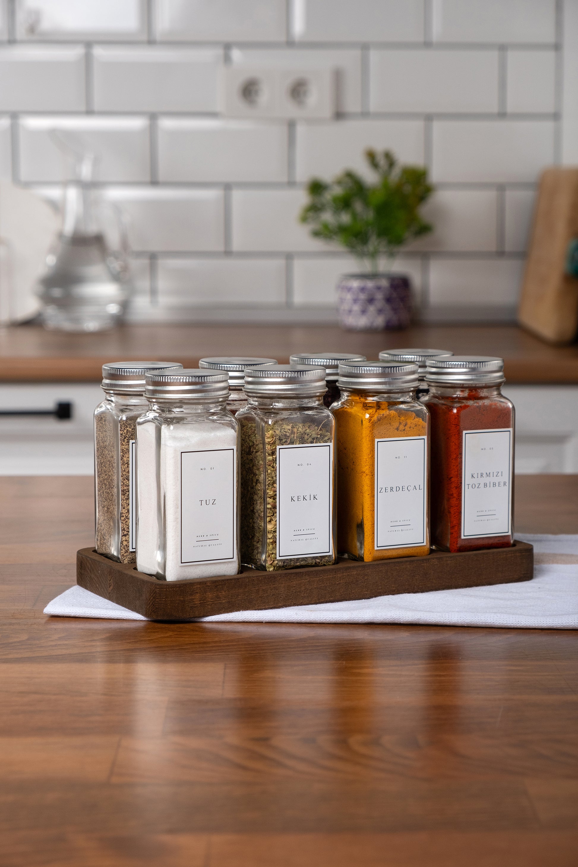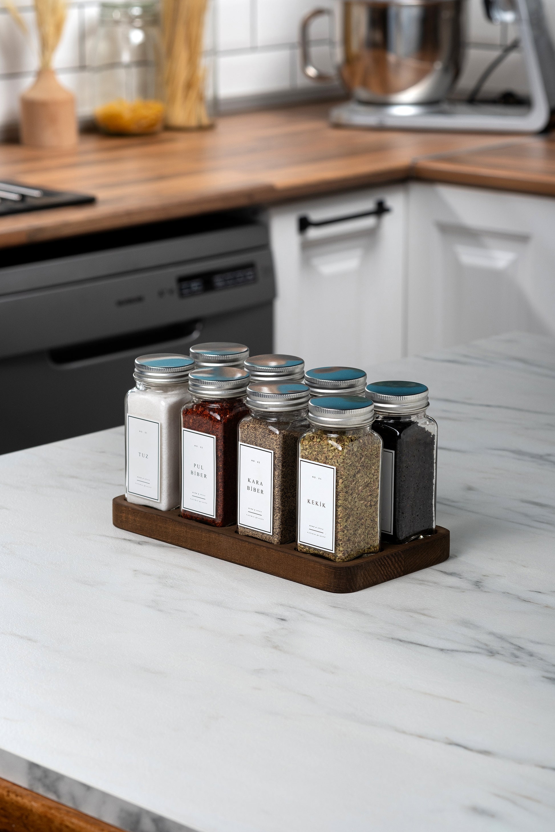 Paket İçeriği : 8 adet Baharatlık, 8 adet iç kapak, 8 adet dış kapak, 12 adet sudan etkilenmez etiket, 1 adet 8'li ahşap stant.