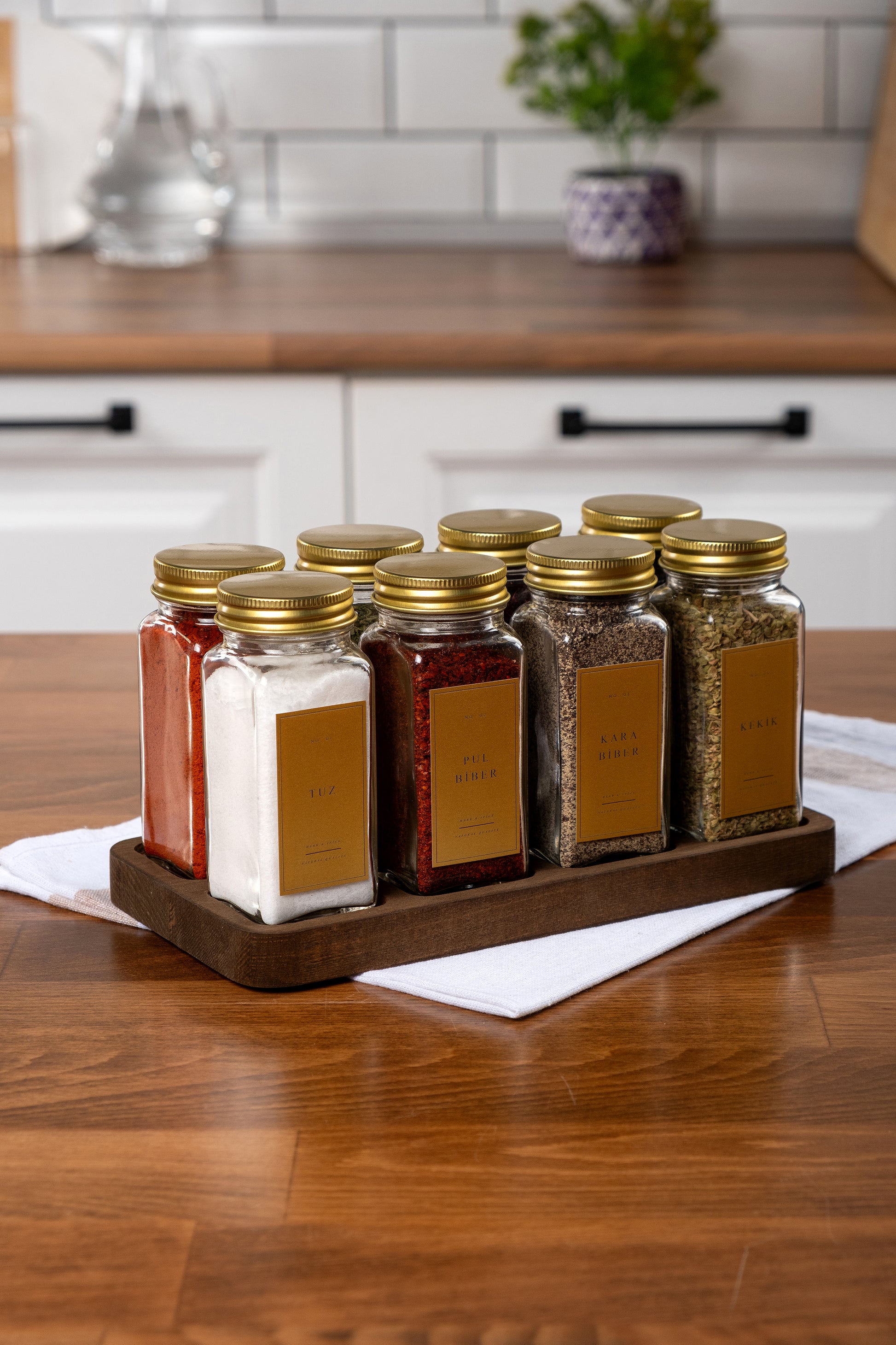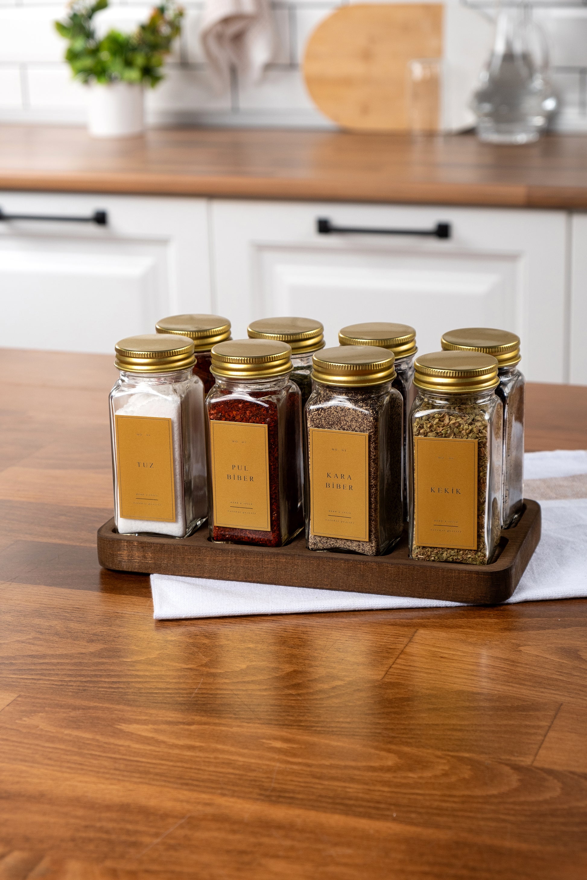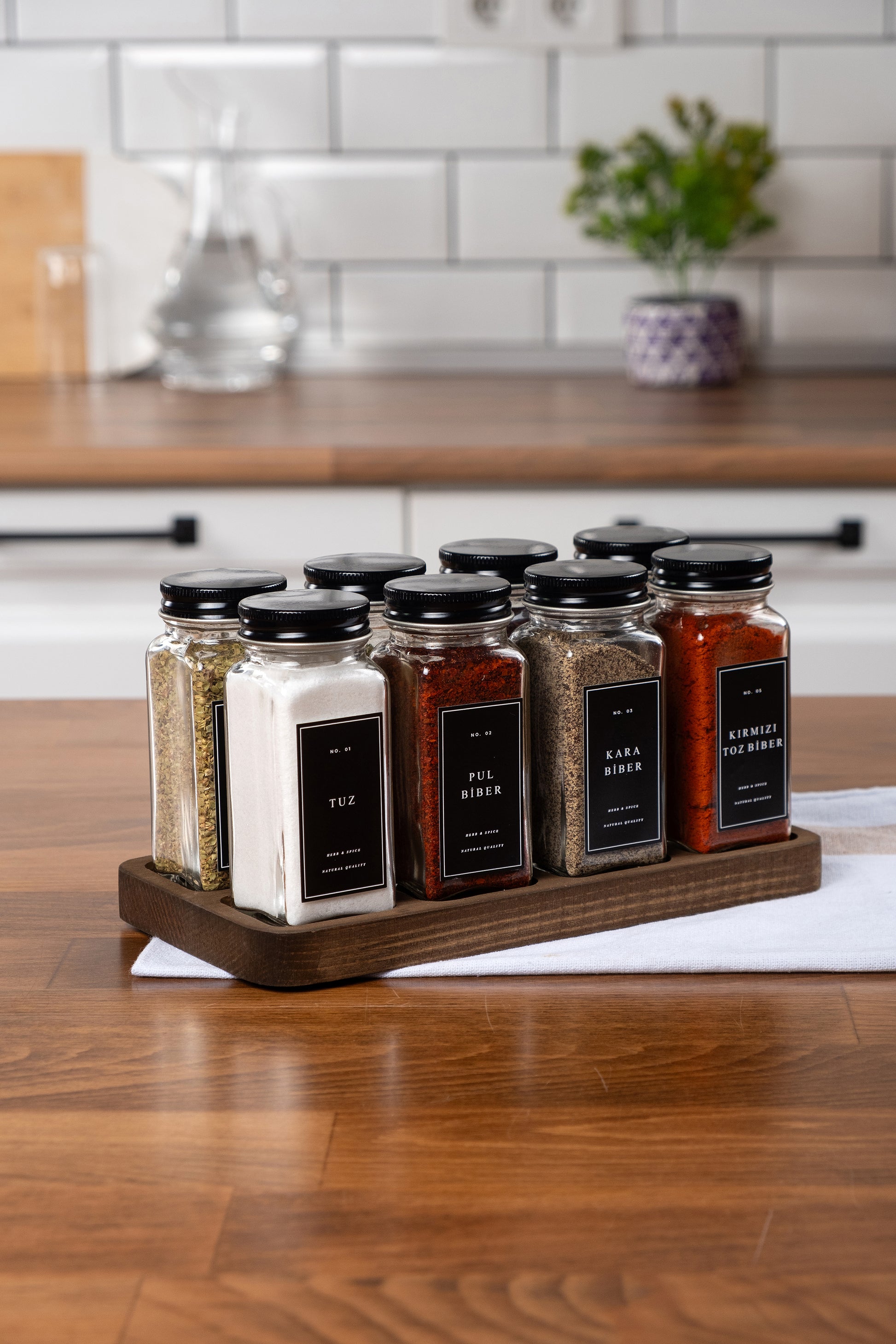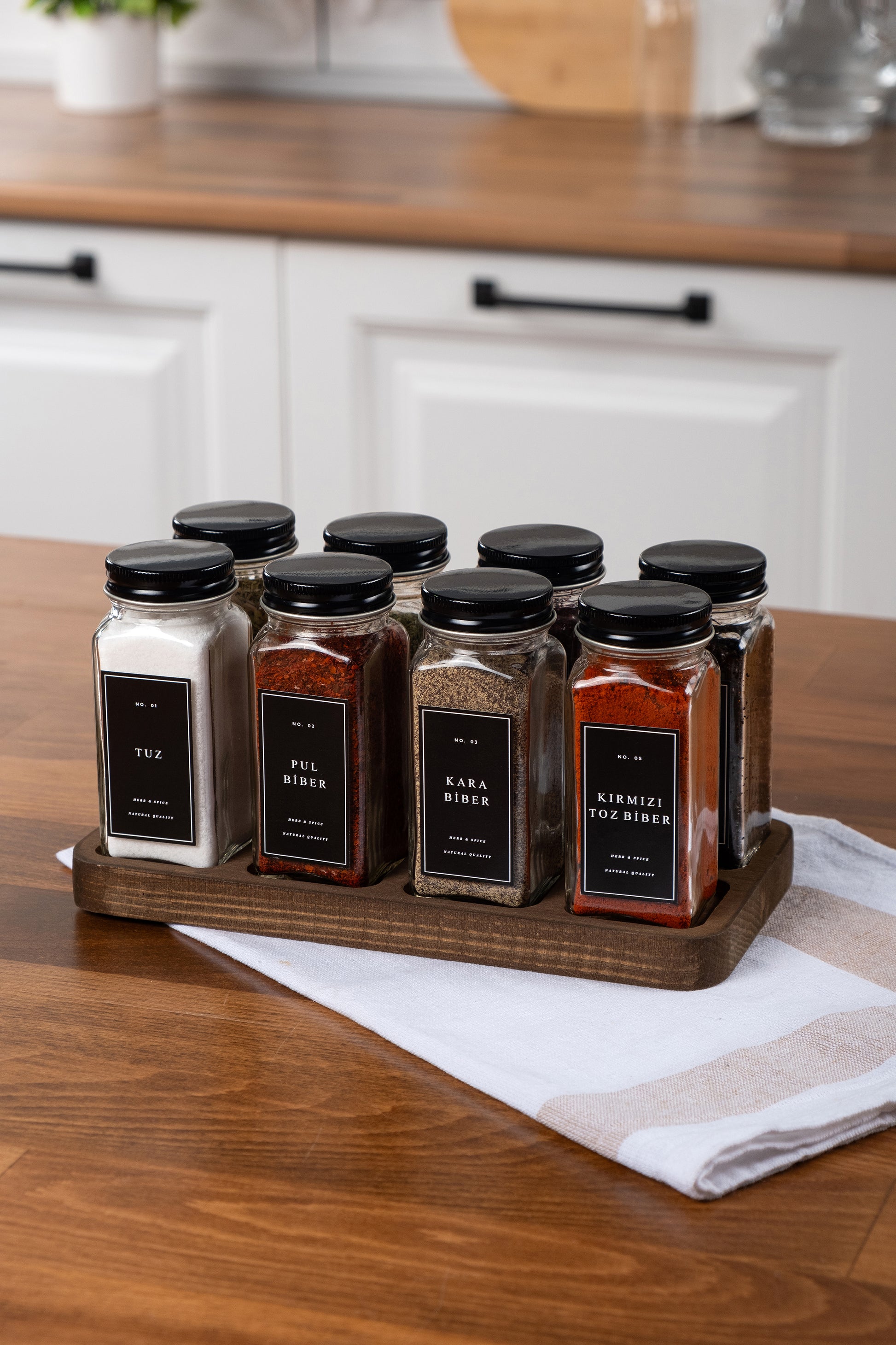 Paket İçeriği : 8 adet Baharatlık, 8 adet iç kapak, 8 adet dış kapak, 12 adet sudan etkilenmez etiket, 1 adet 8'li ahşap stant.
