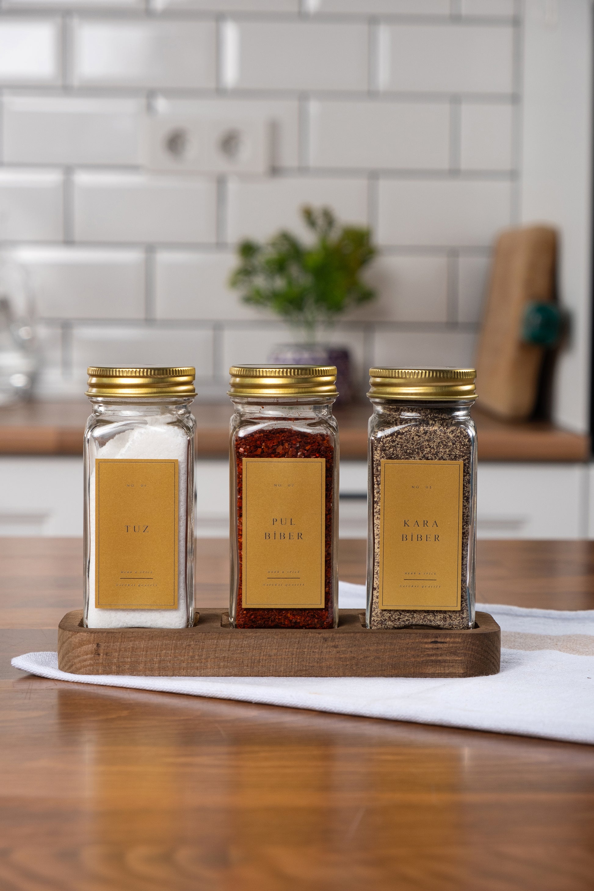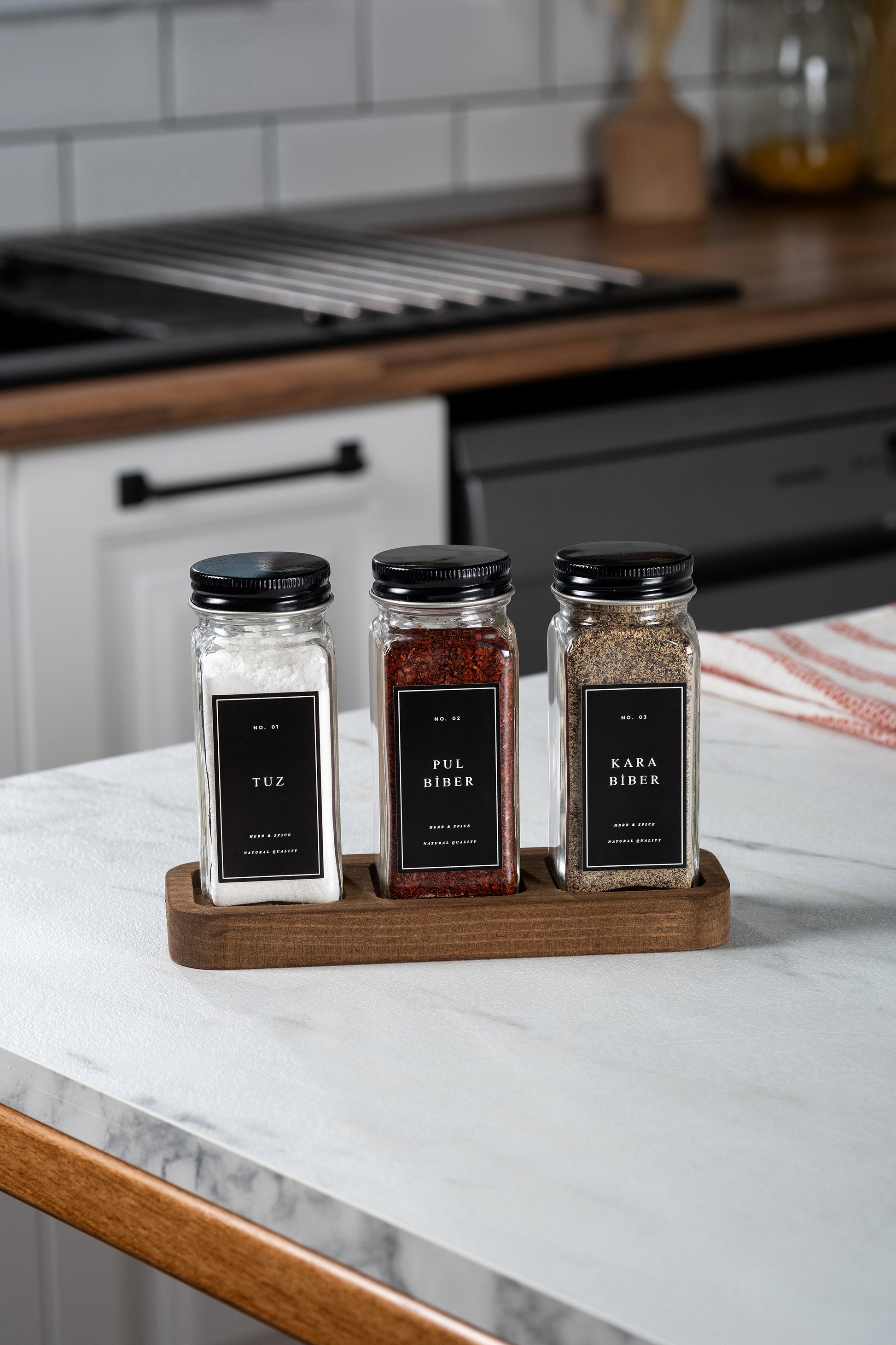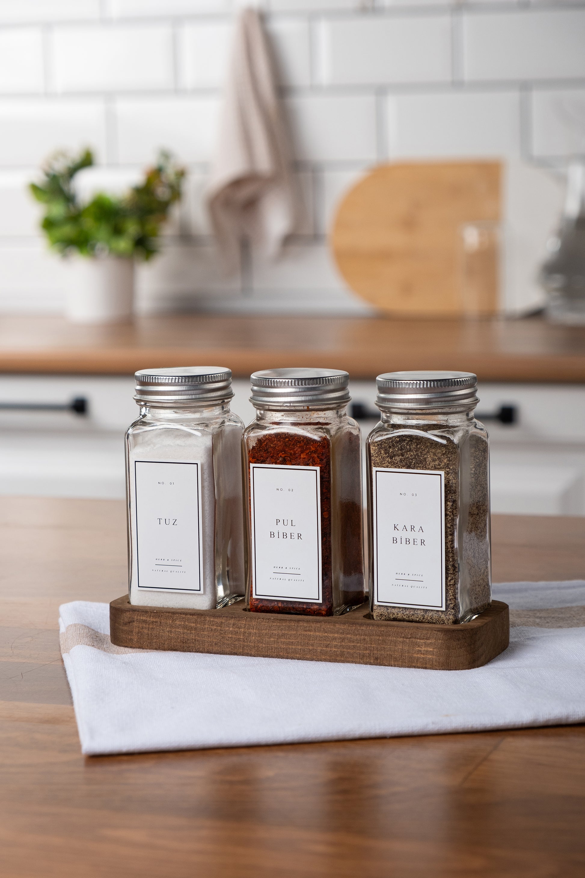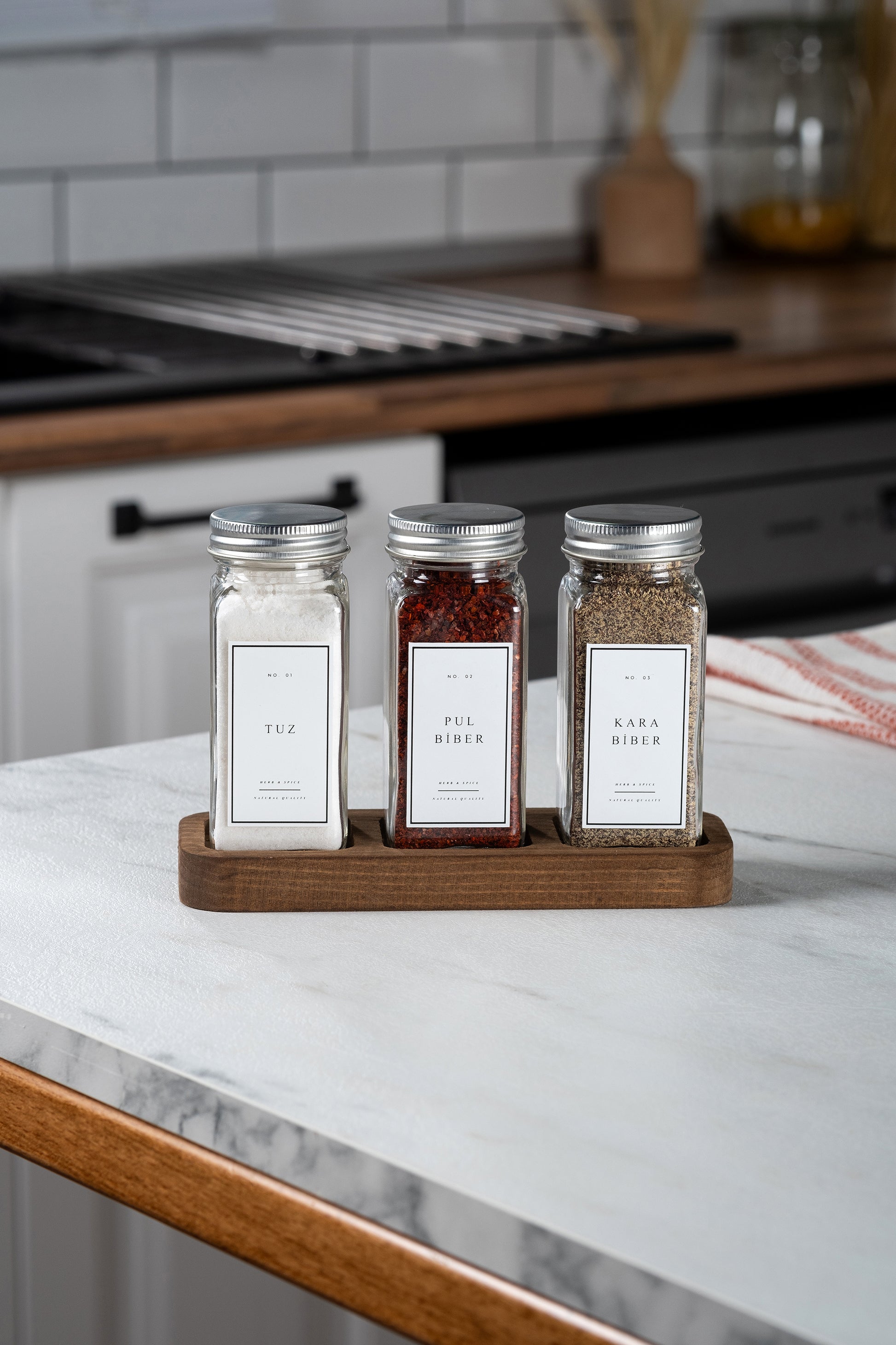 Paket İçeriği; 3 adet Baharatlık, 3 adet iç kapak, 3 adet dış kapak, 6 adet sudan etkilenmez etiket, 1 adet 3'lü ahşap stant,