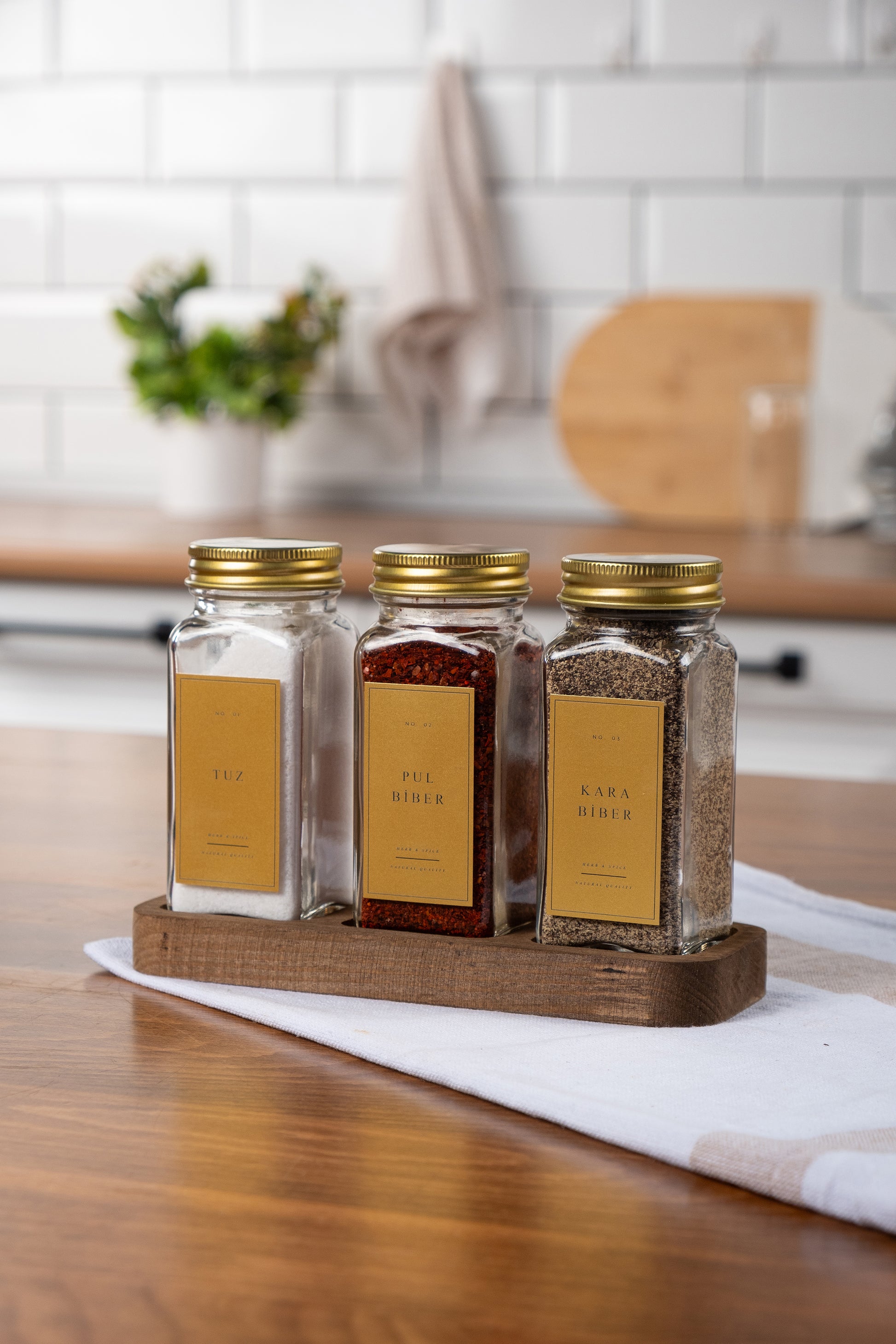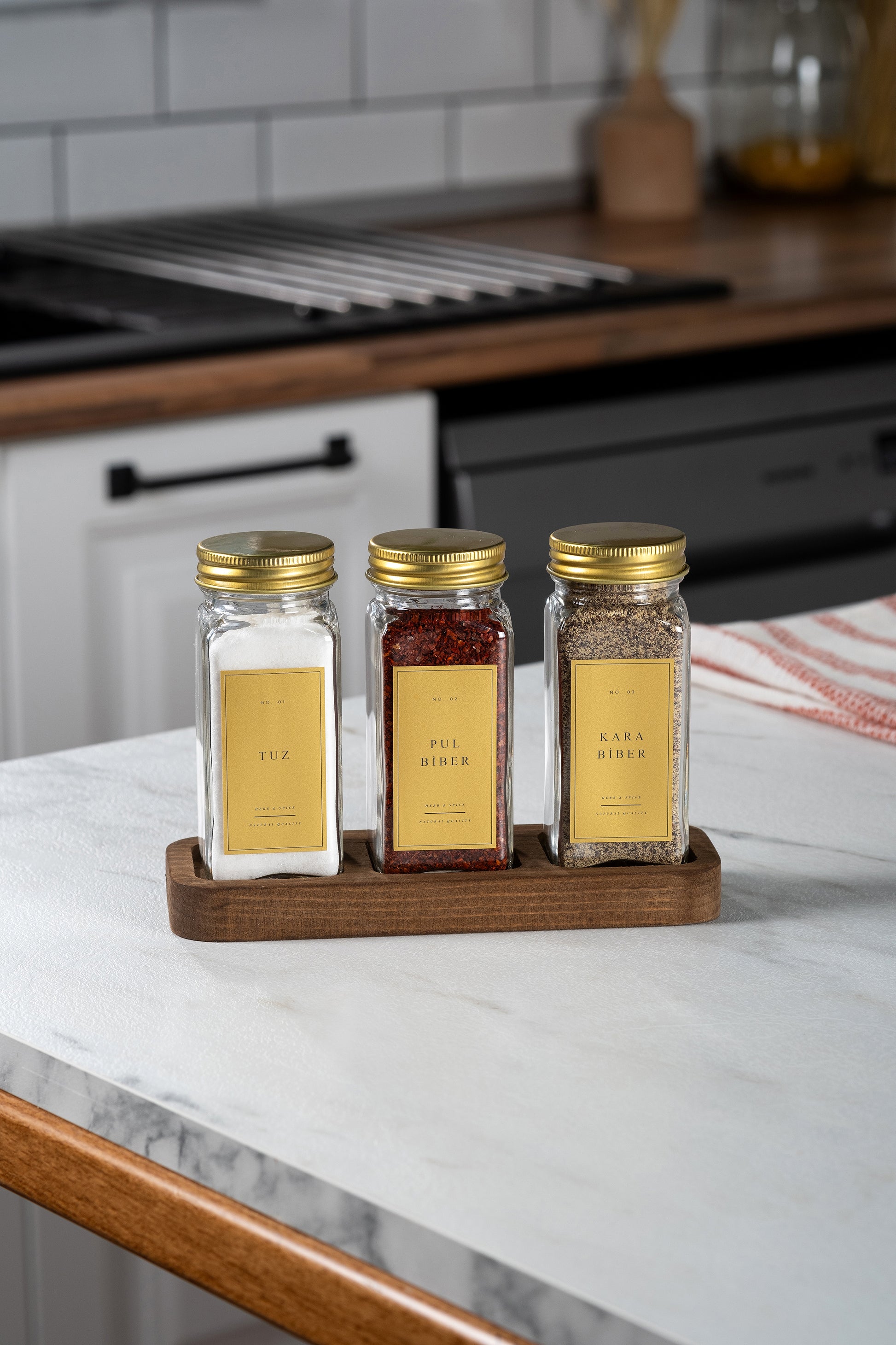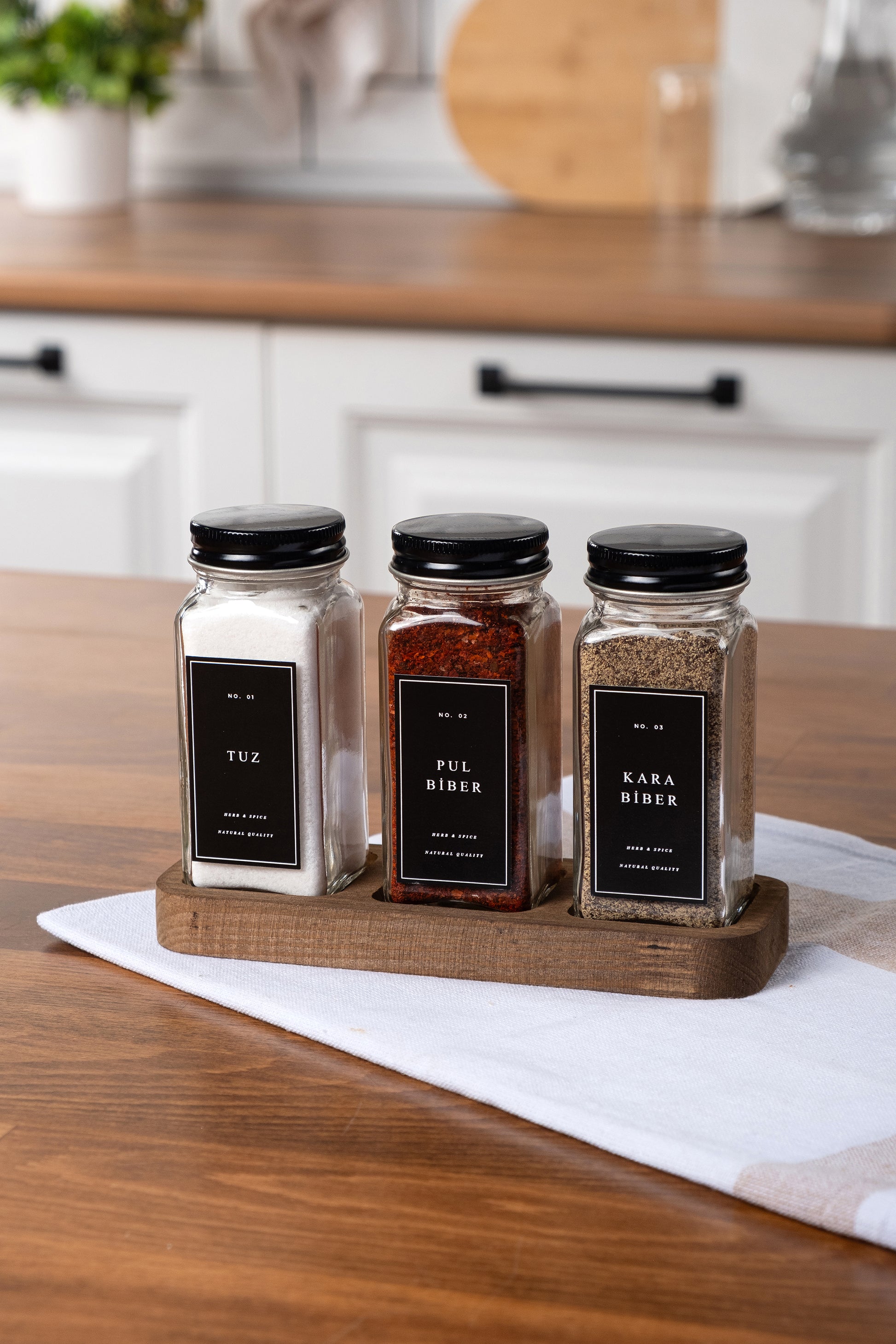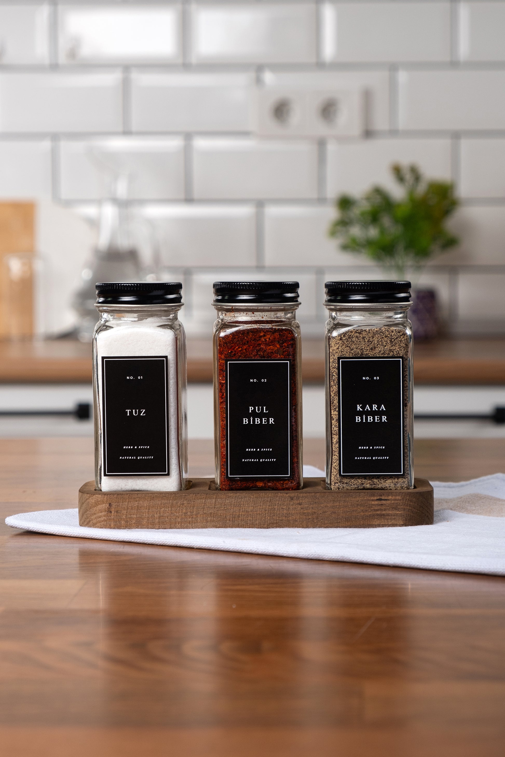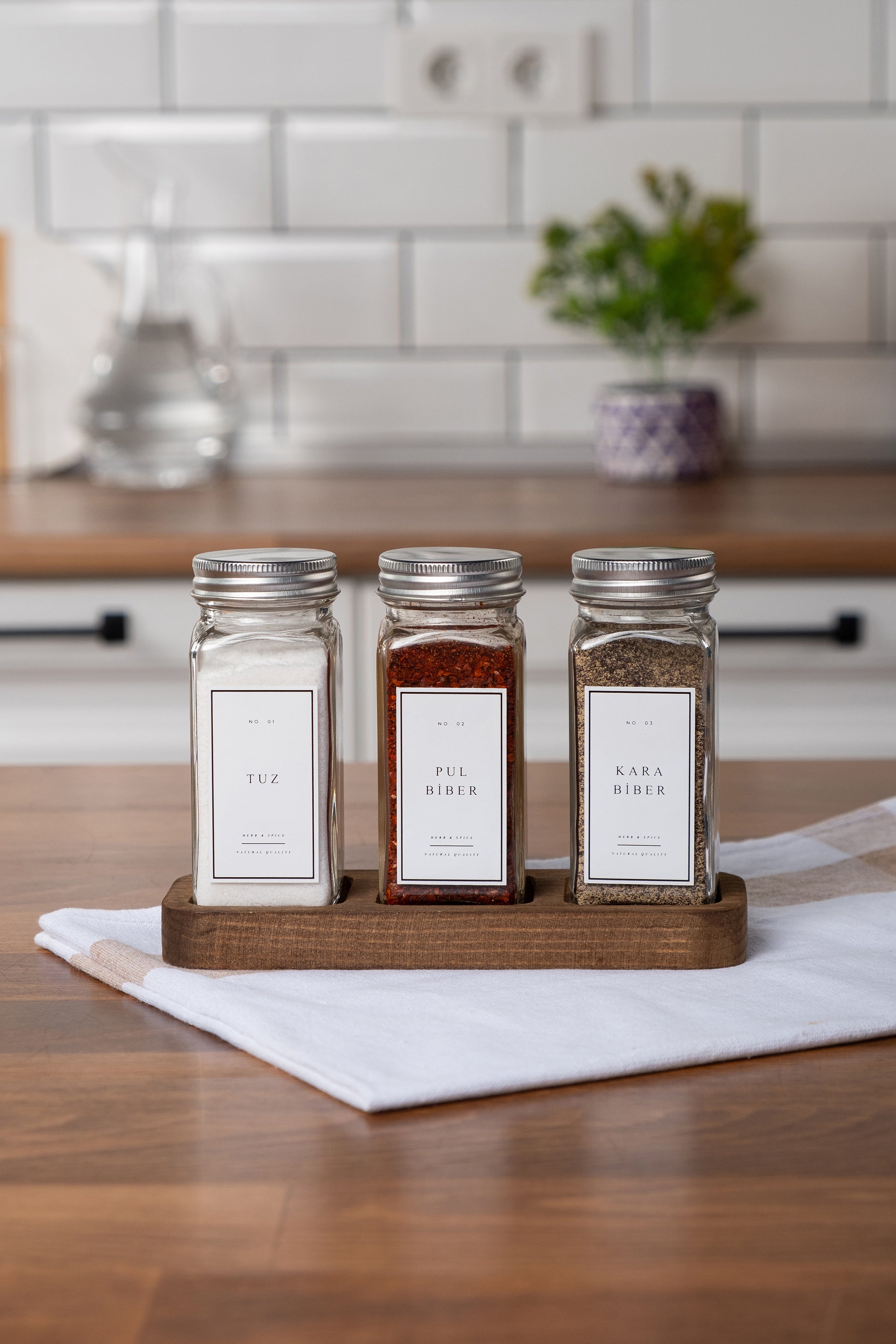 Paket İçeriği; 3 adet Baharatlık, 3 adet iç kapak, 3 adet dış kapak, 6 adet sudan etkilenmez etiket, 1 adet 3'lü ahşap stant,