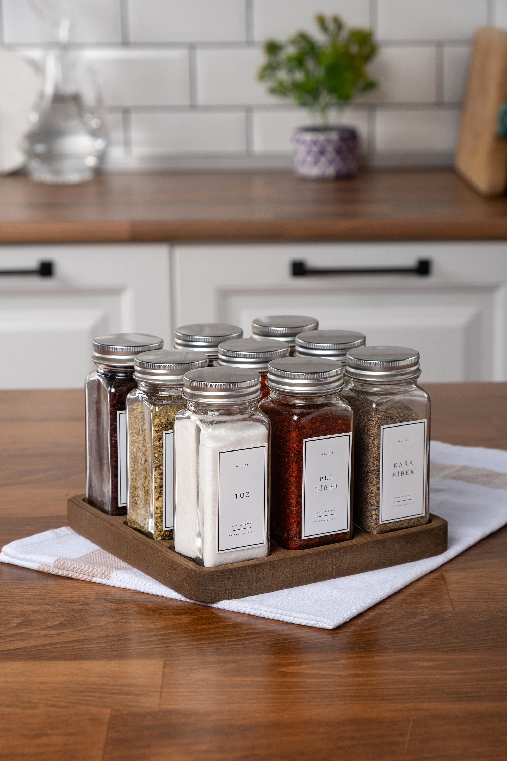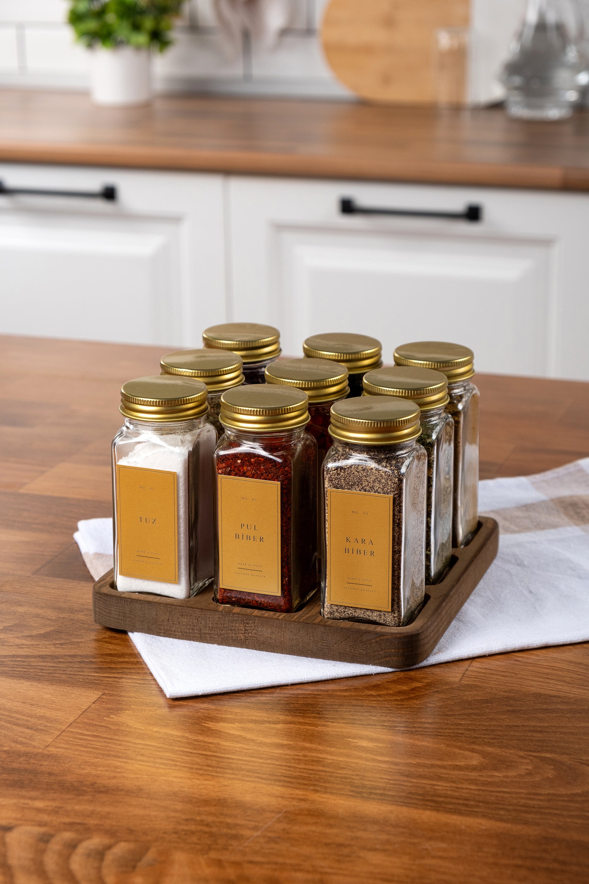 Paket İçeriği : 9 adet Baharatlık, 9 adet iç kapak, 9 adet dış kapak, 12 adet sudan etkilenmez etiket, 1 adet 9'lu ahşap stant.