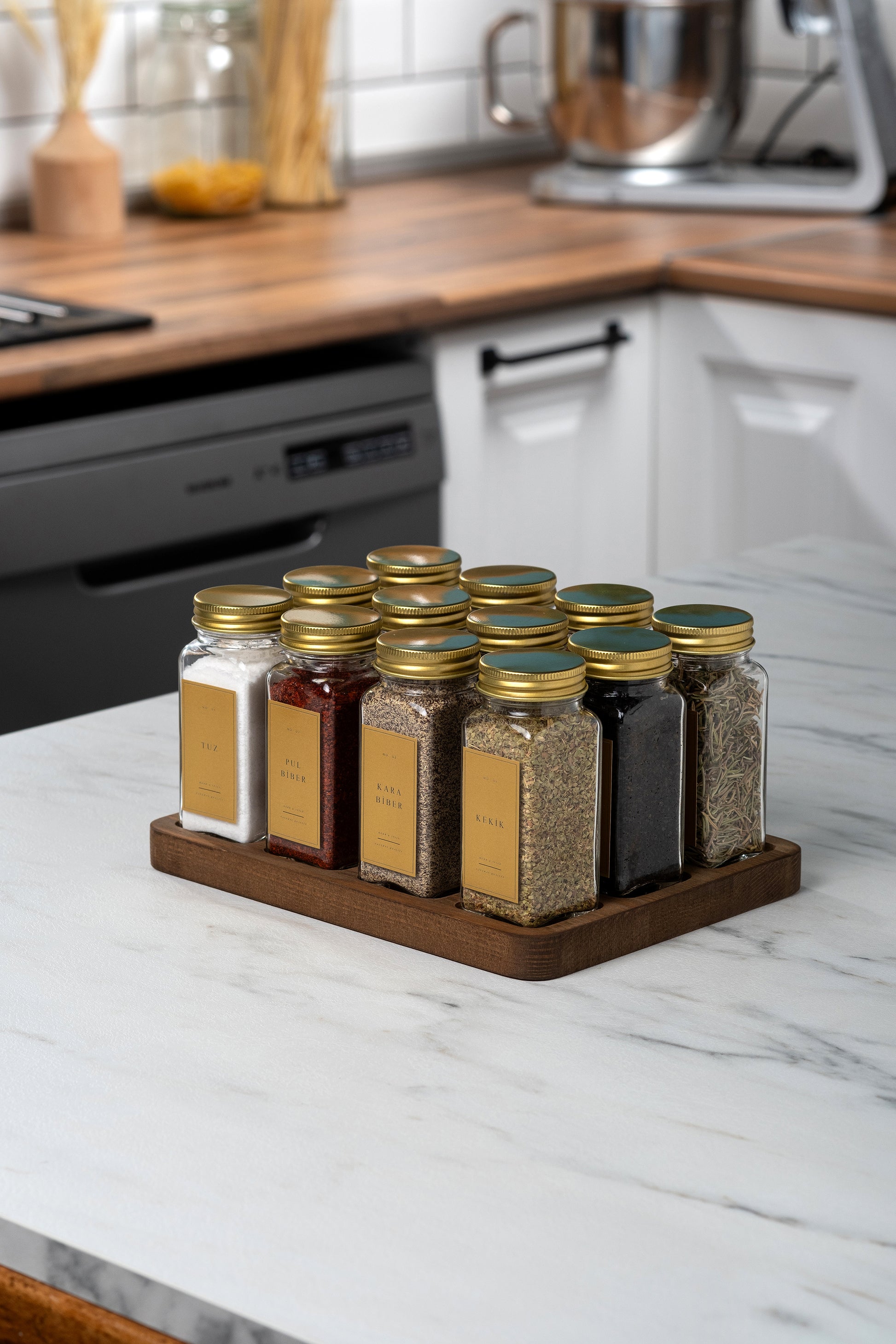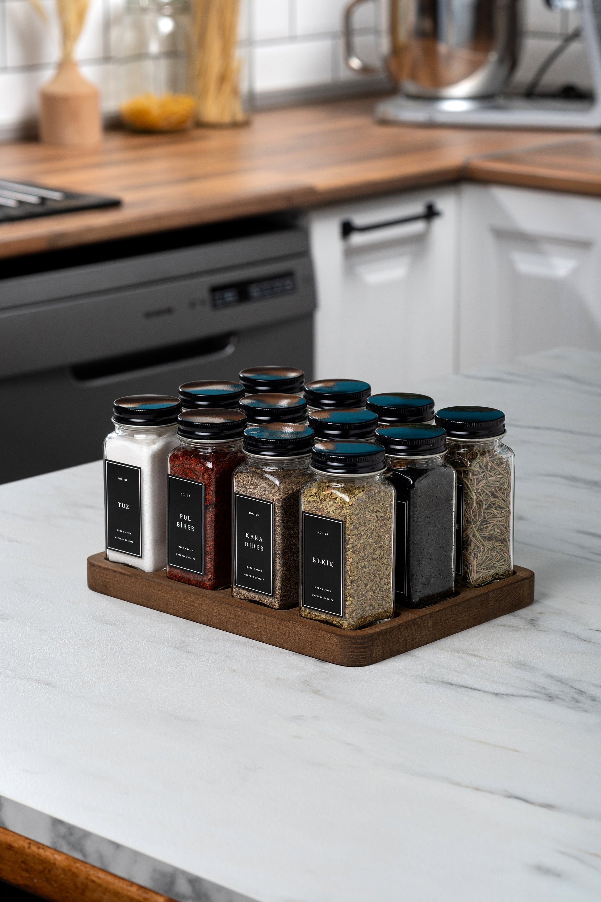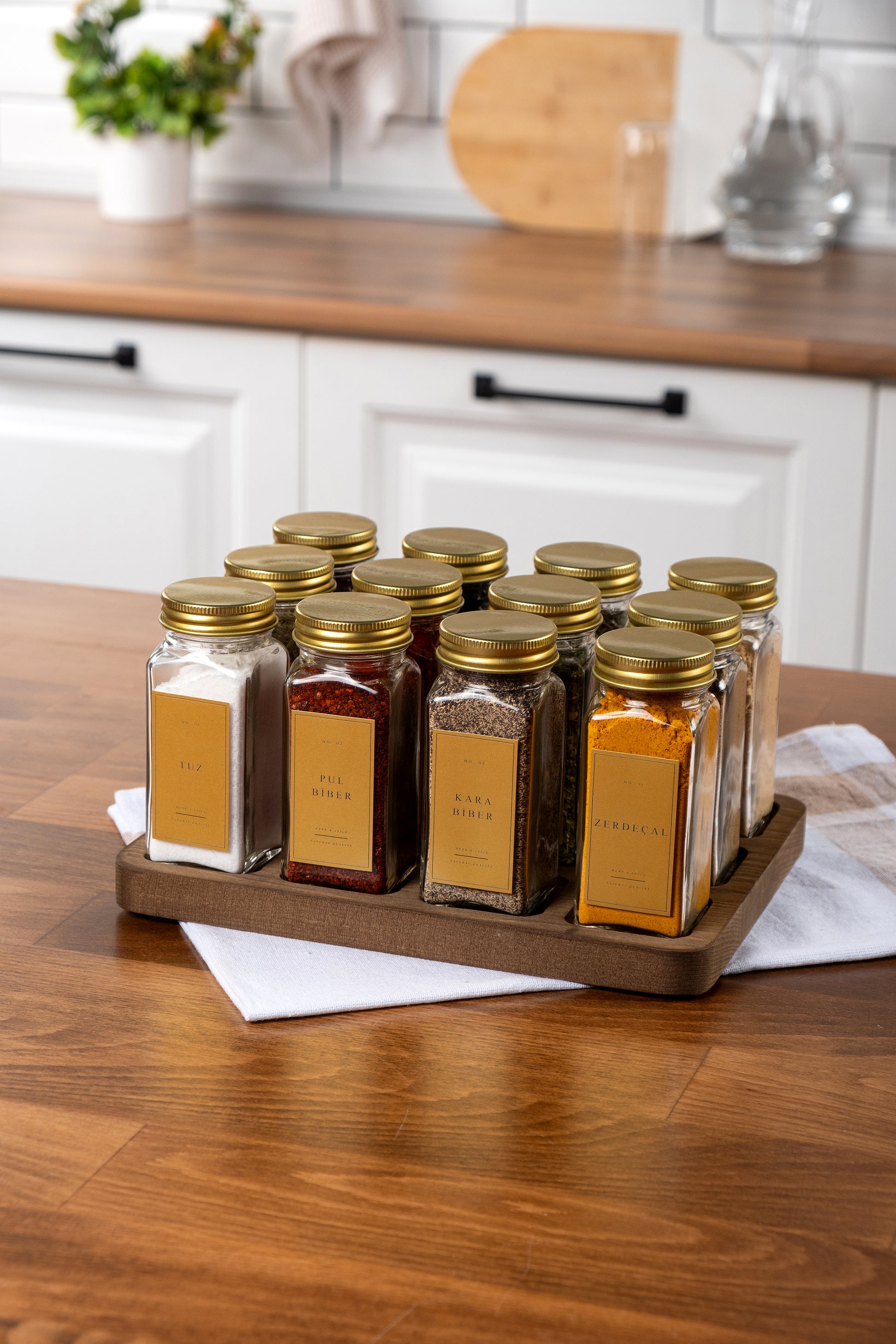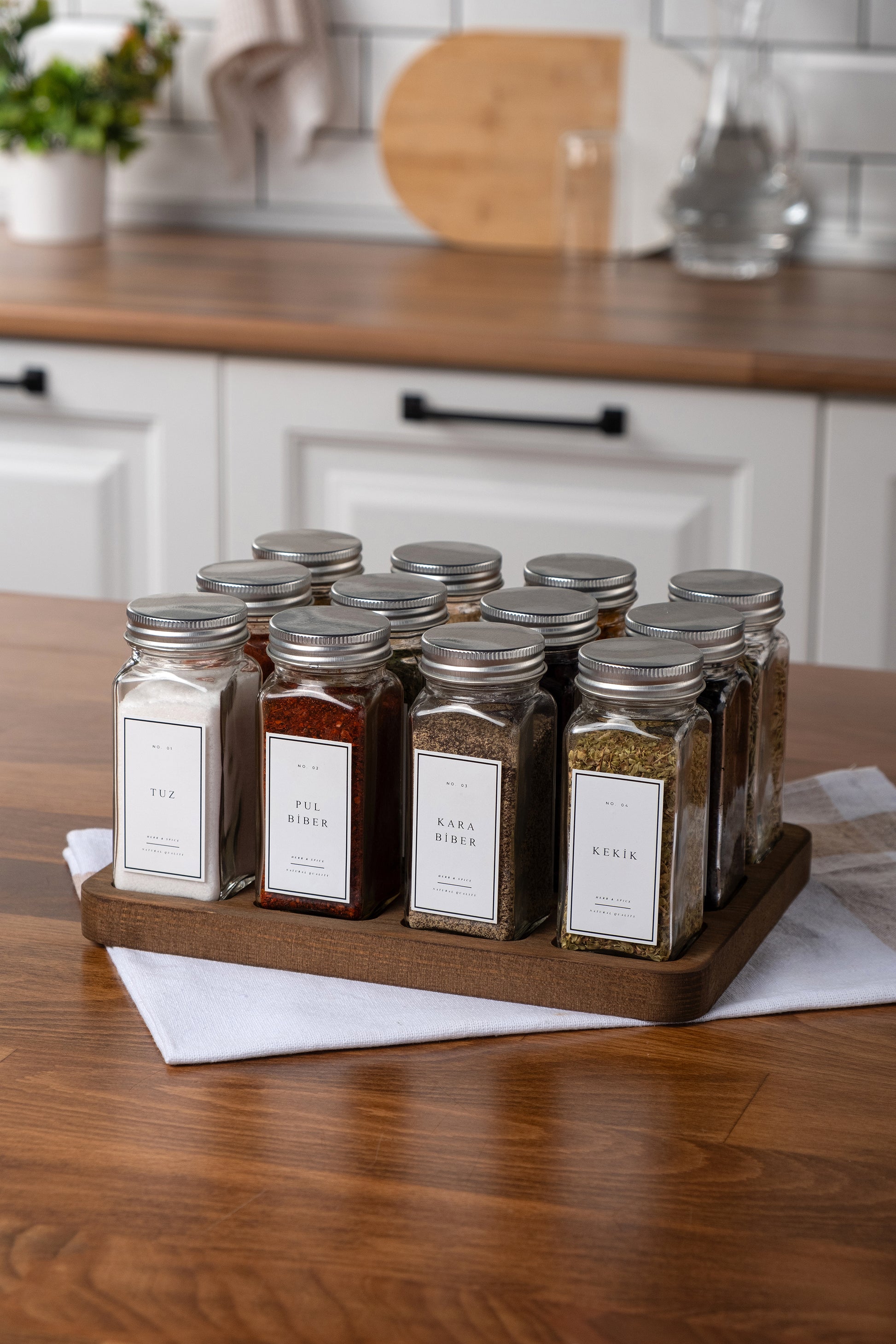 Paket İçeriği : 12 adet Baharatlık, 12 adet iç kapak, 12 adet Gümüş renk dış kapak, 18 adet sudan etkilenmez beyaz etiket, 1 adet 12'li ahşap stant.
