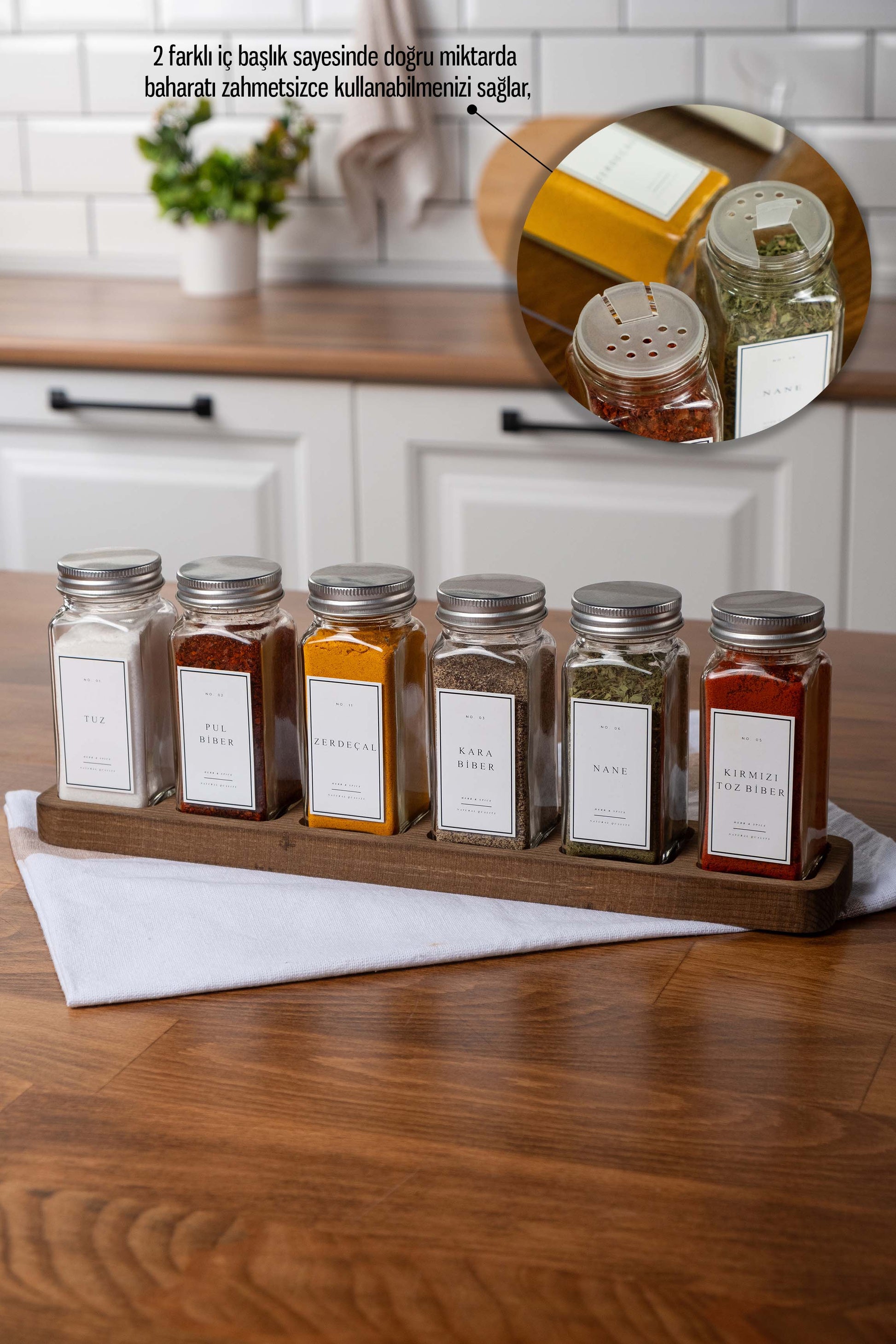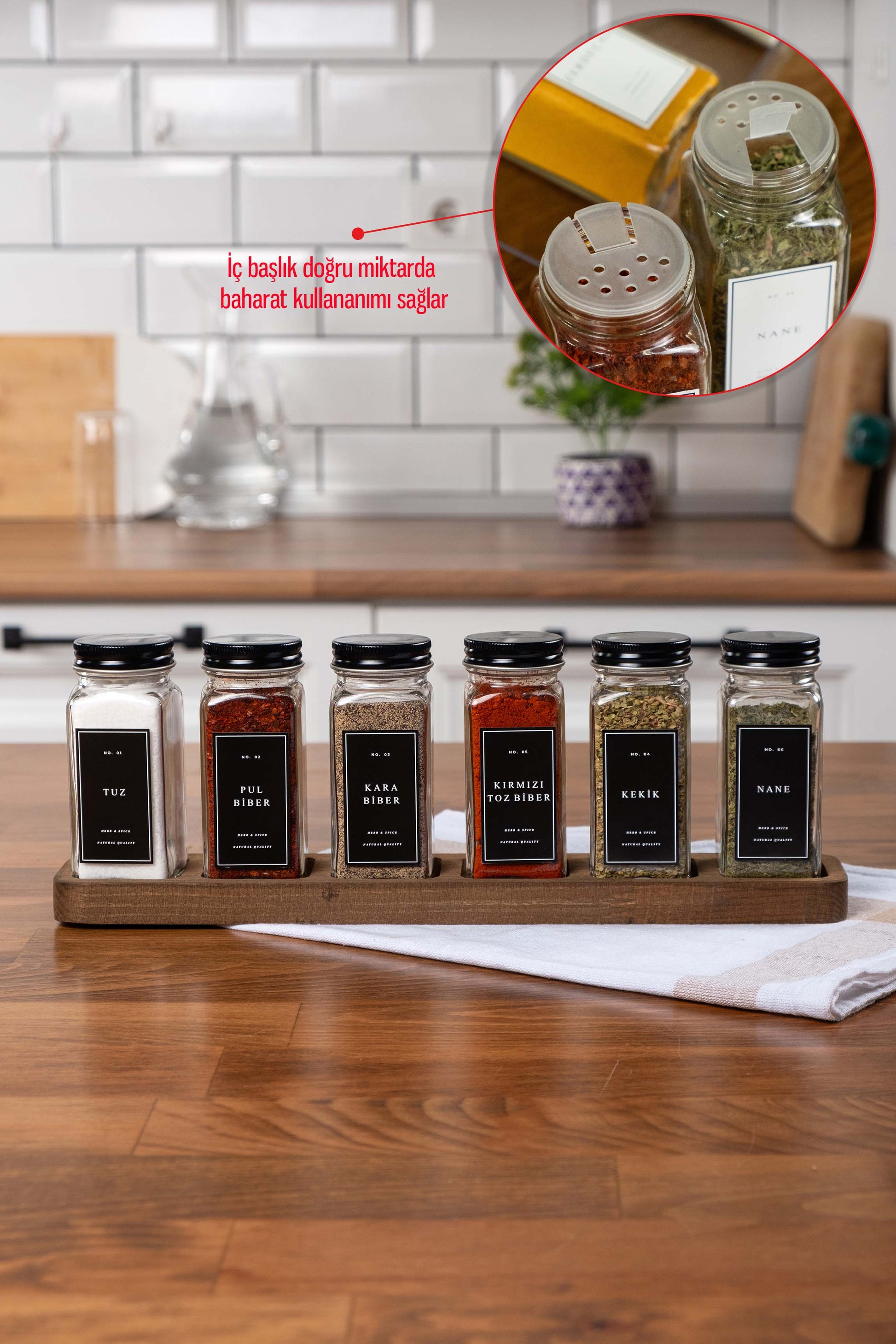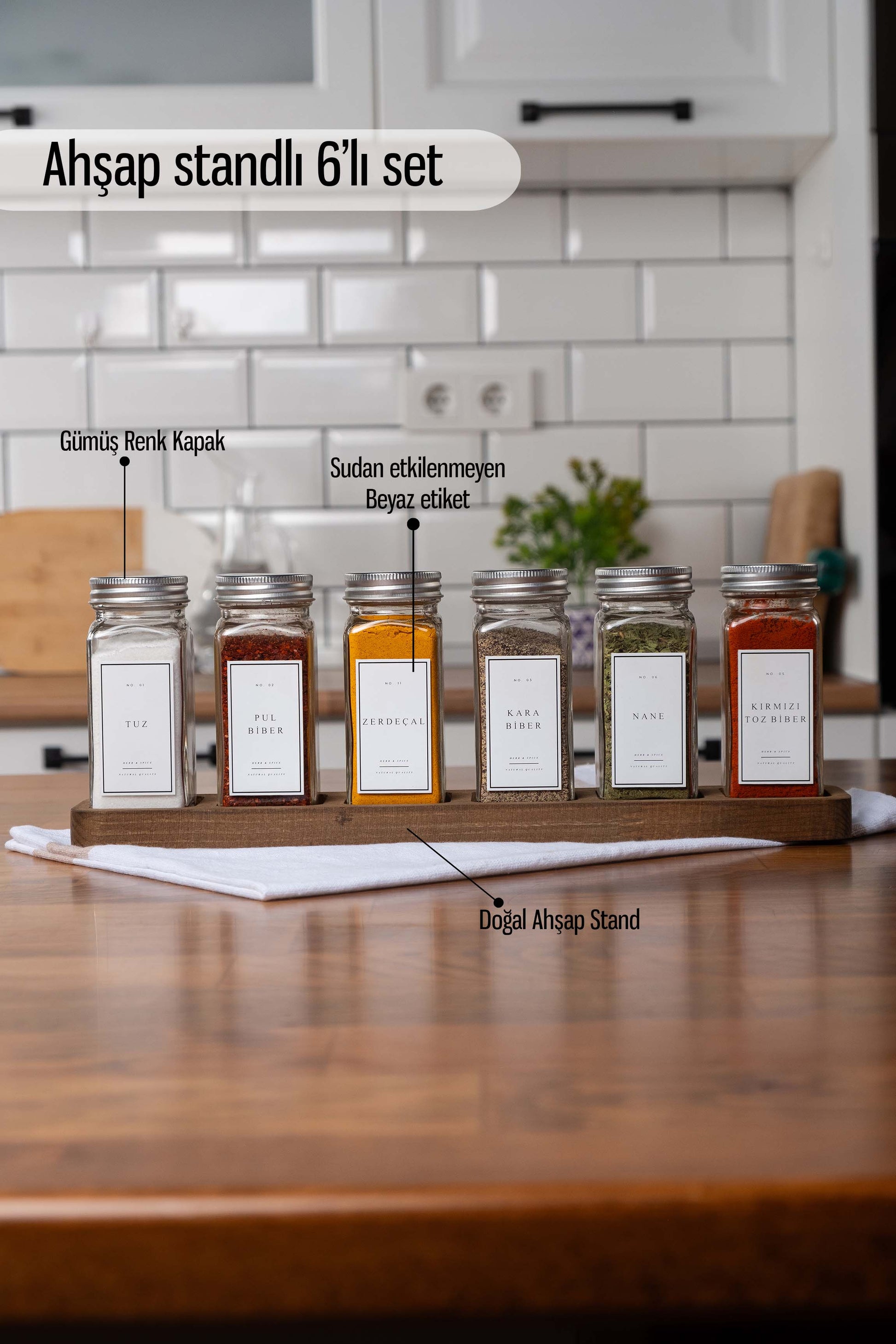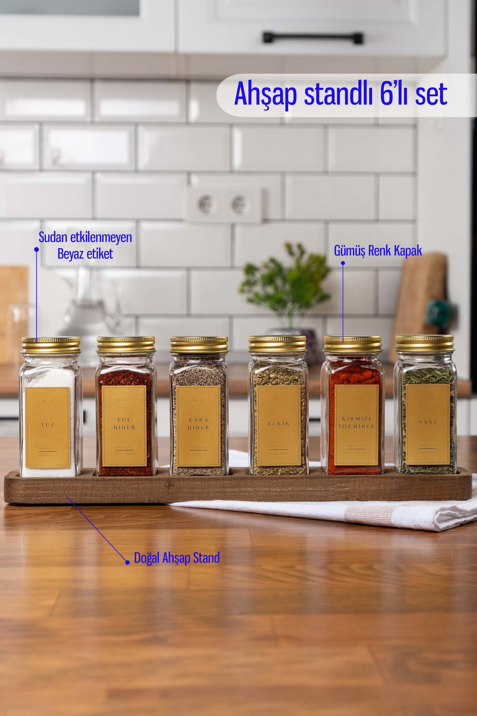 Paket İçeriği; 6 adet Baharatlık, 6 adet iç kapak, 6 adet dış kapak, 12 adet sudan etkilenmez etiket, 1 adet 6'lı ahşap stant,