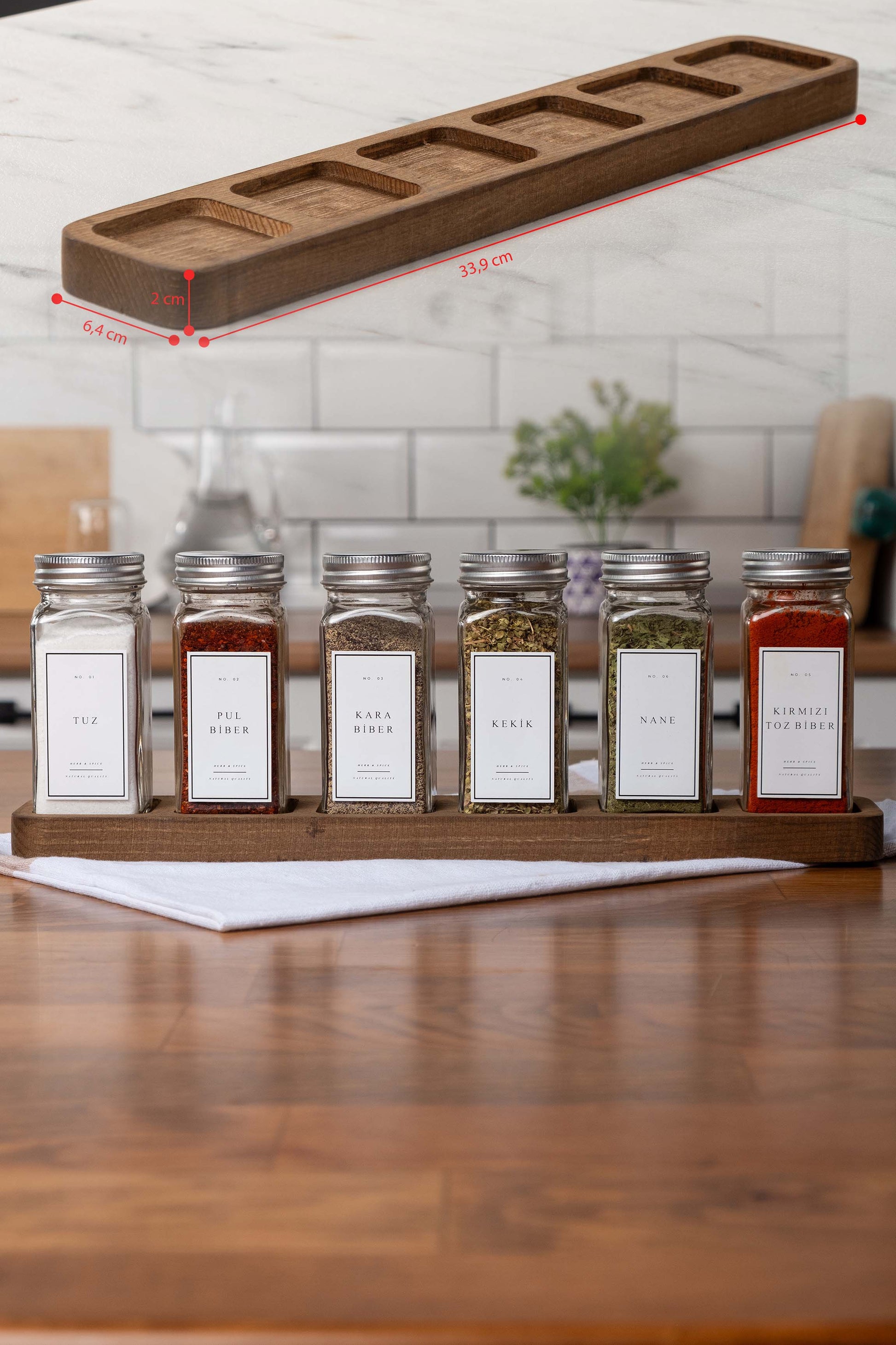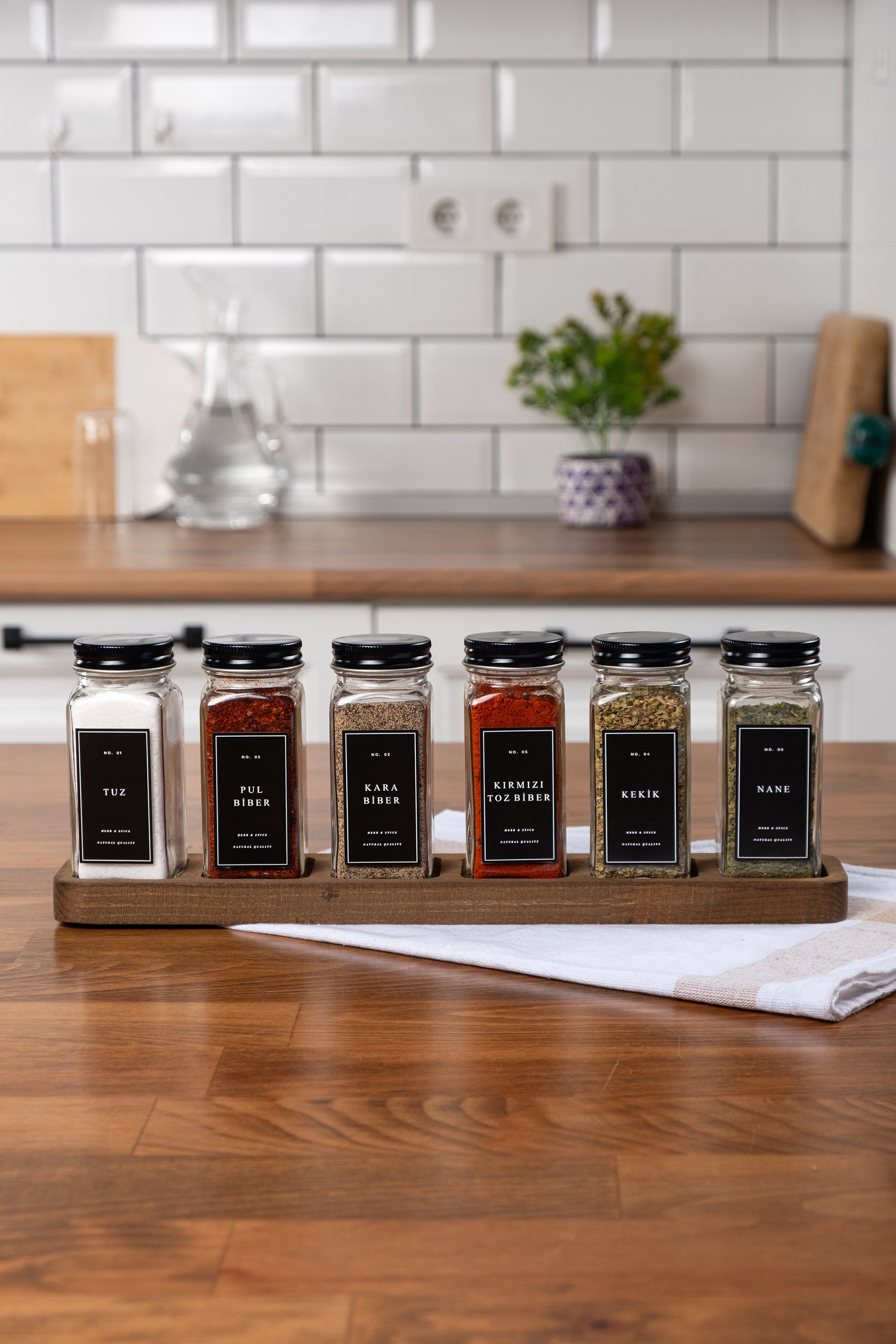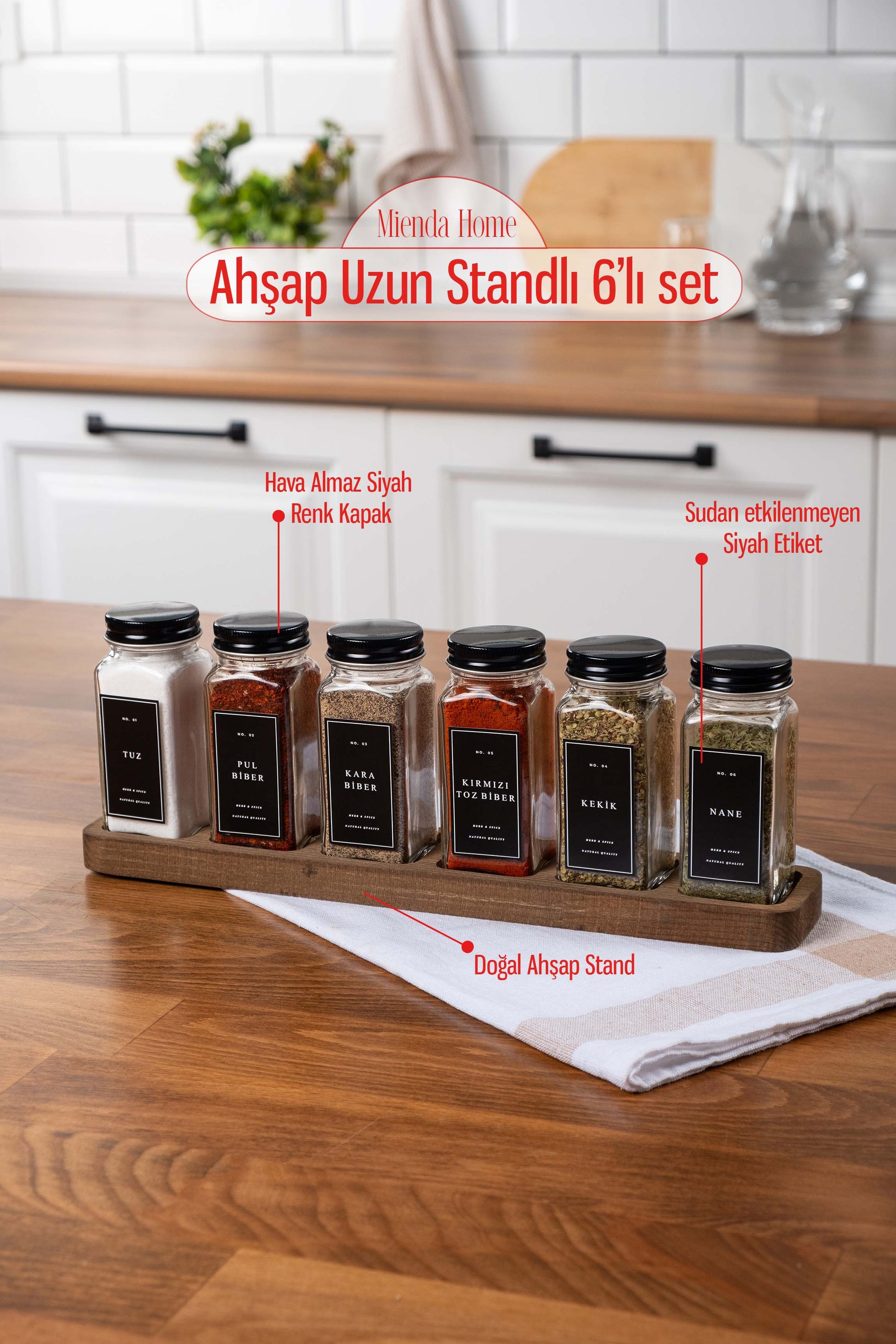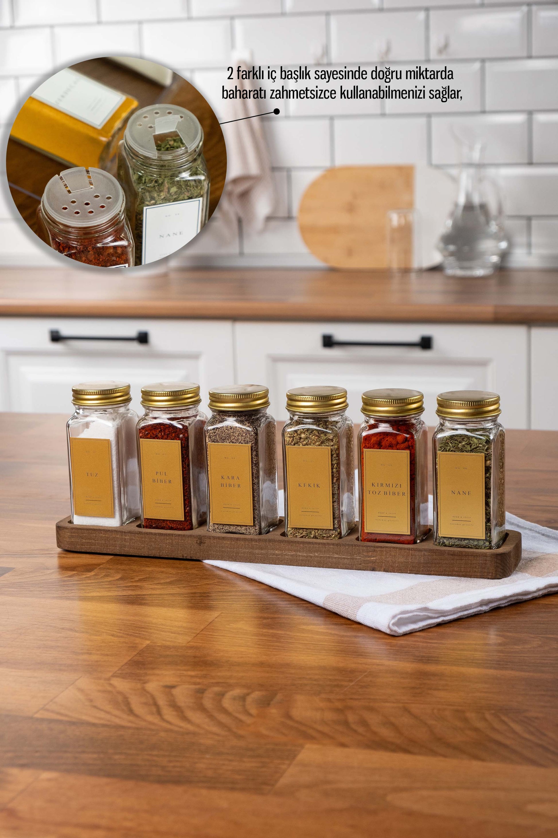 Paket İçeriği; 6 adet Baharatlık, 6 adet iç kapak, 6 adet dış kapak, 12 adet sudan etkilenmez etiket, 1 adet 6'lı ahşap stant,