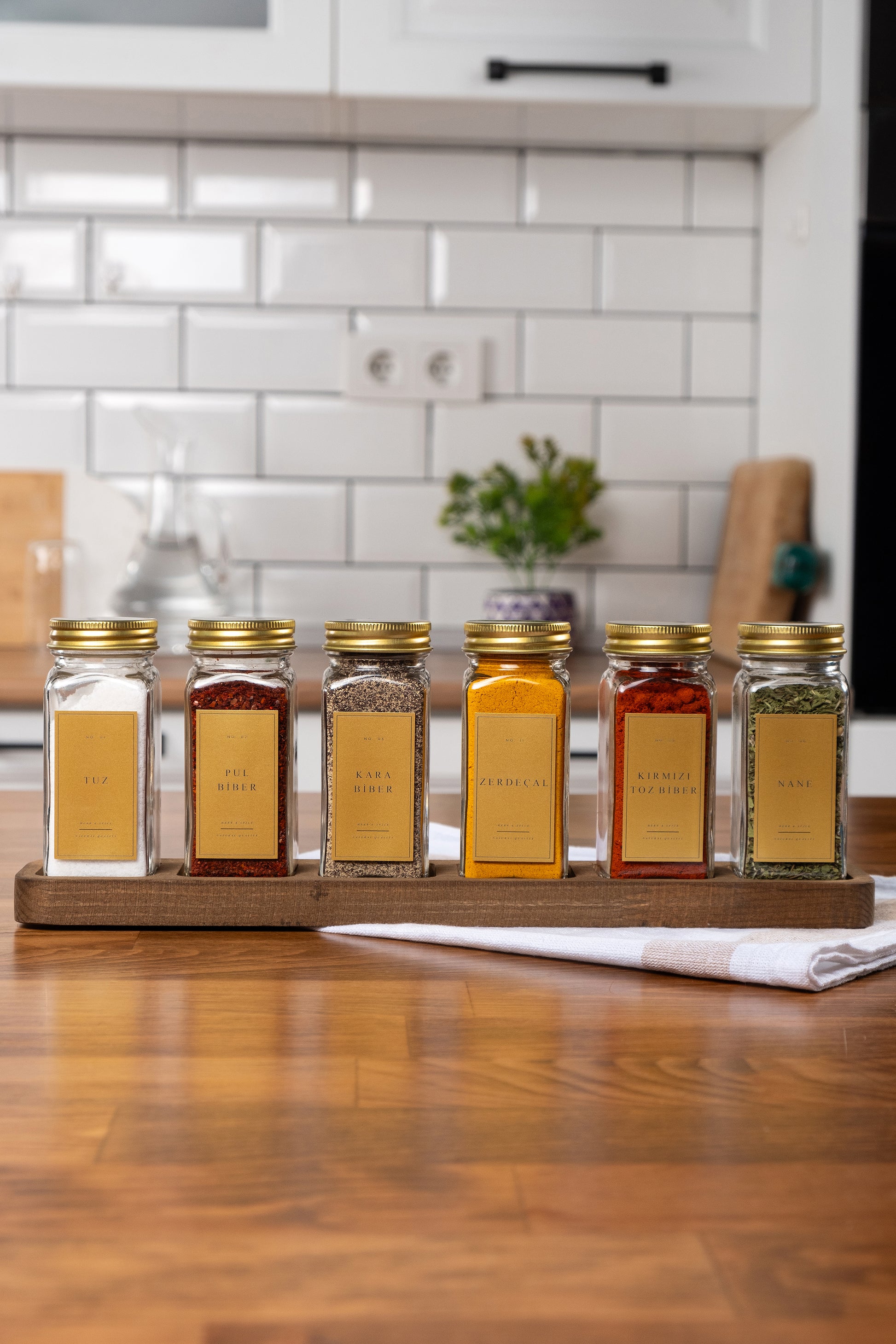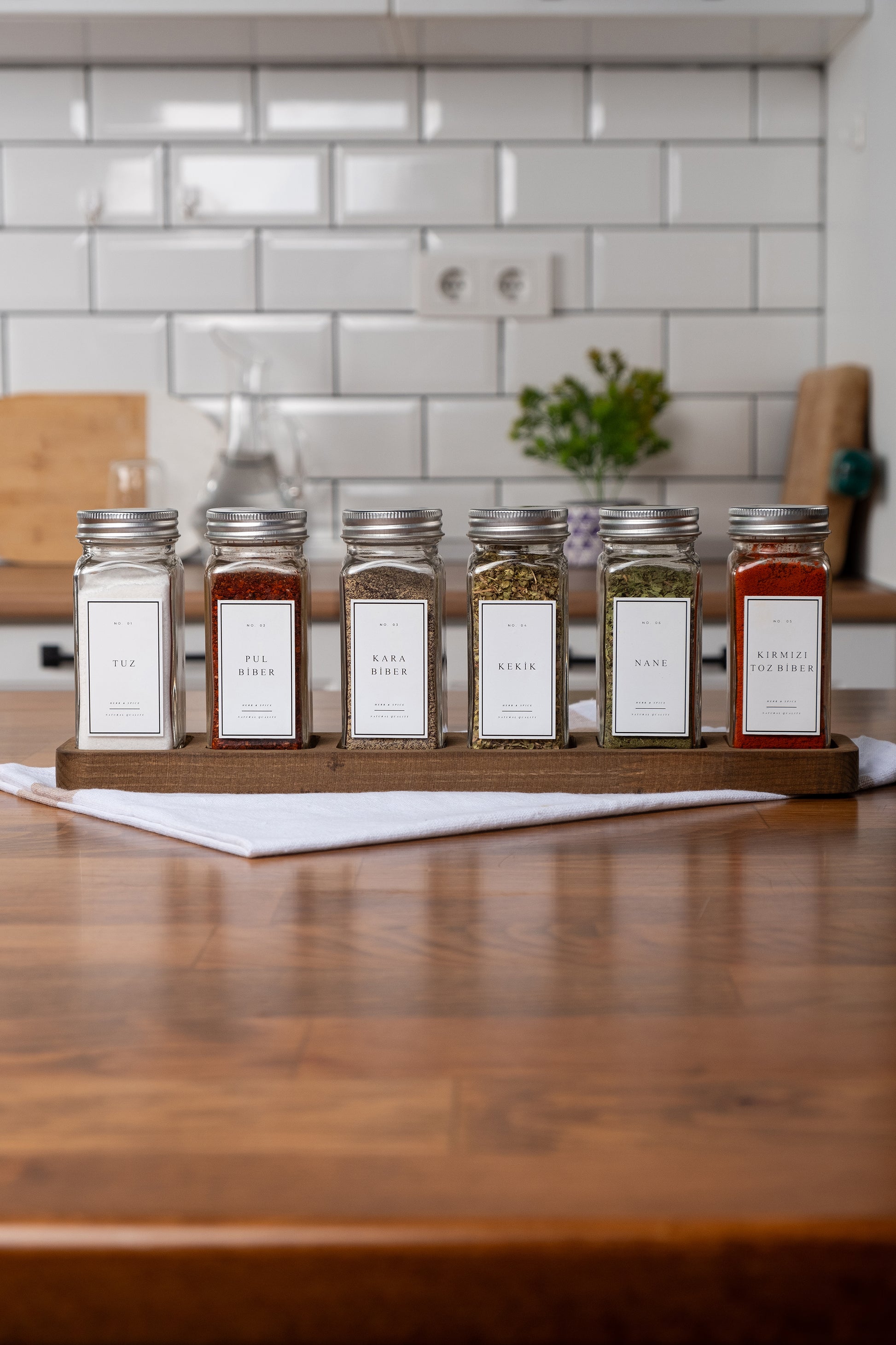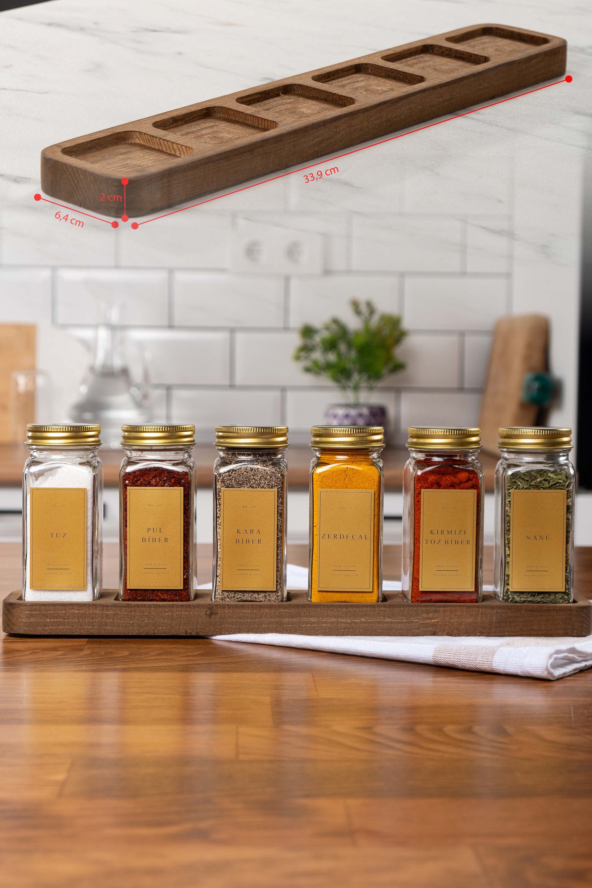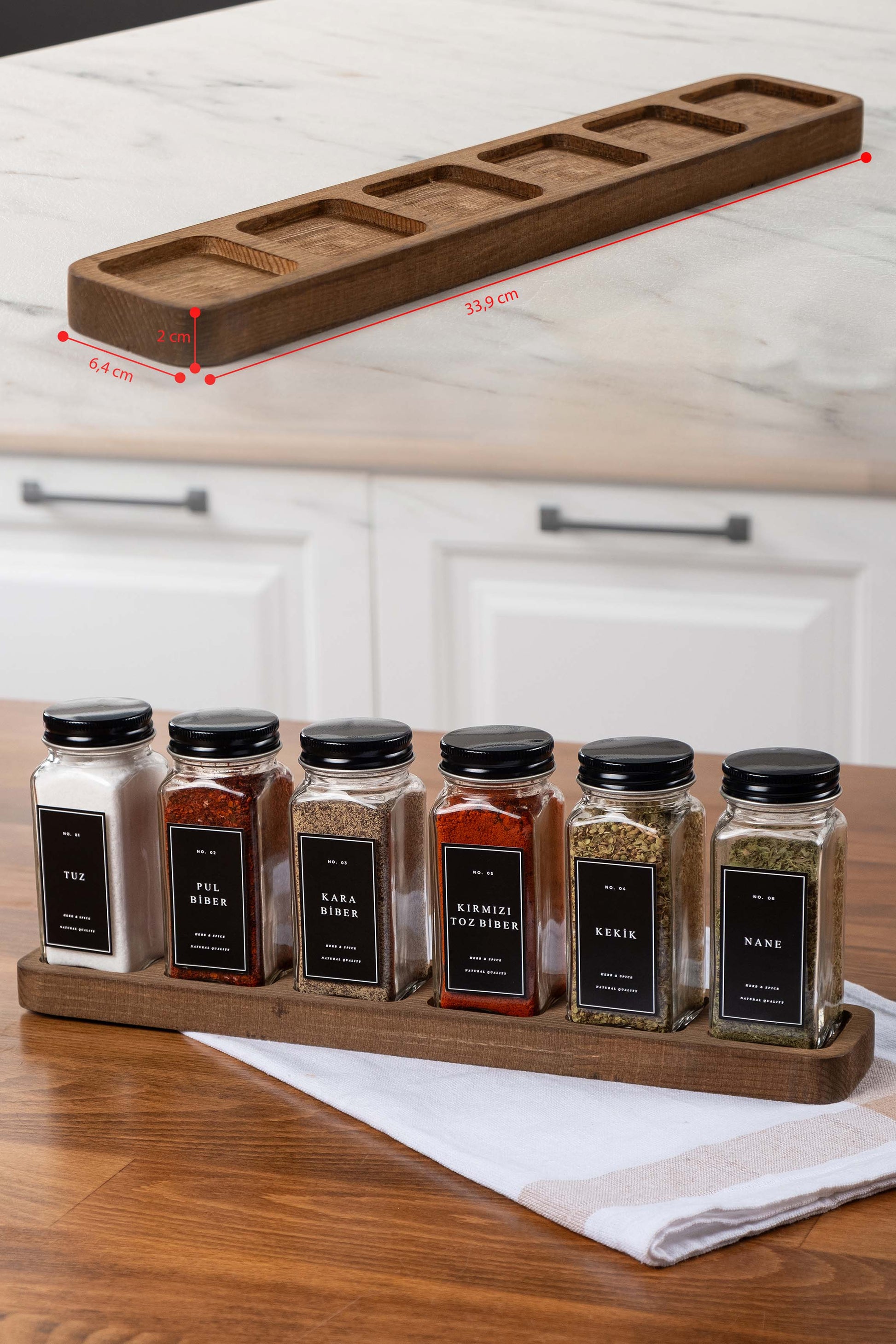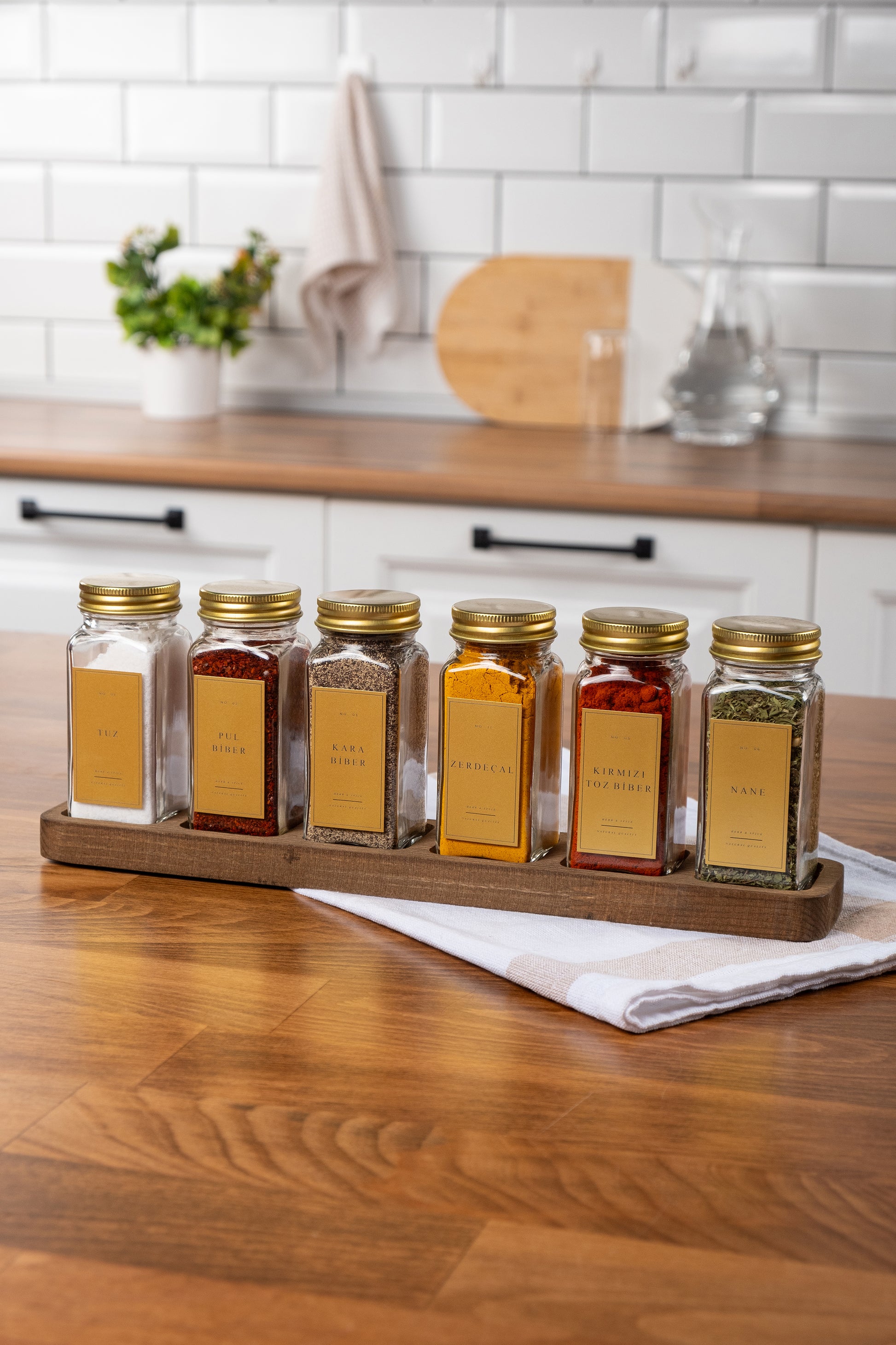 Paket İçeriği; 6 adet Baharatlık, 6 adet iç kapak, 6 adet dış kapak, 12 adet sudan etkilenmez etiket, 1 adet 6'lı ahşap stant,