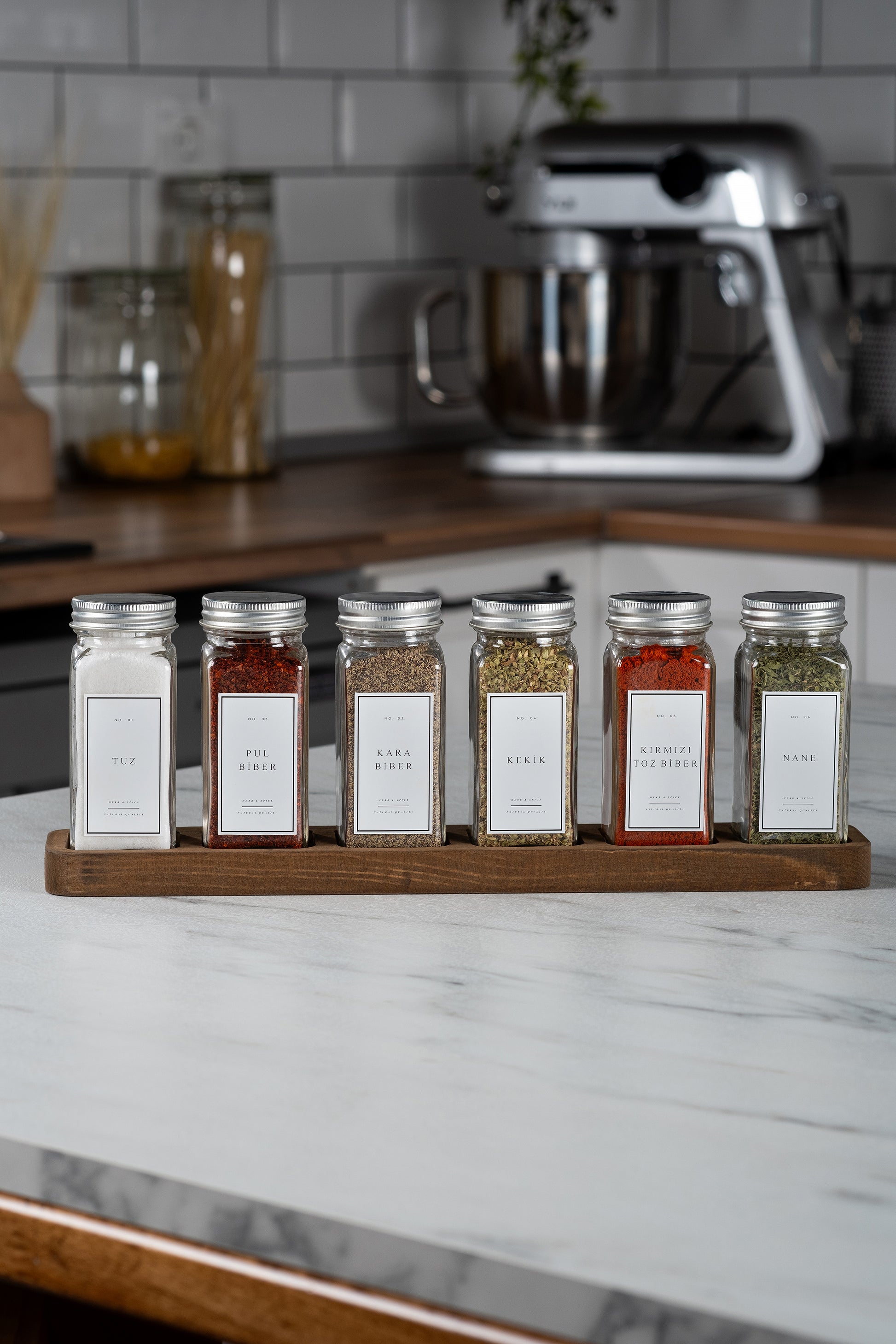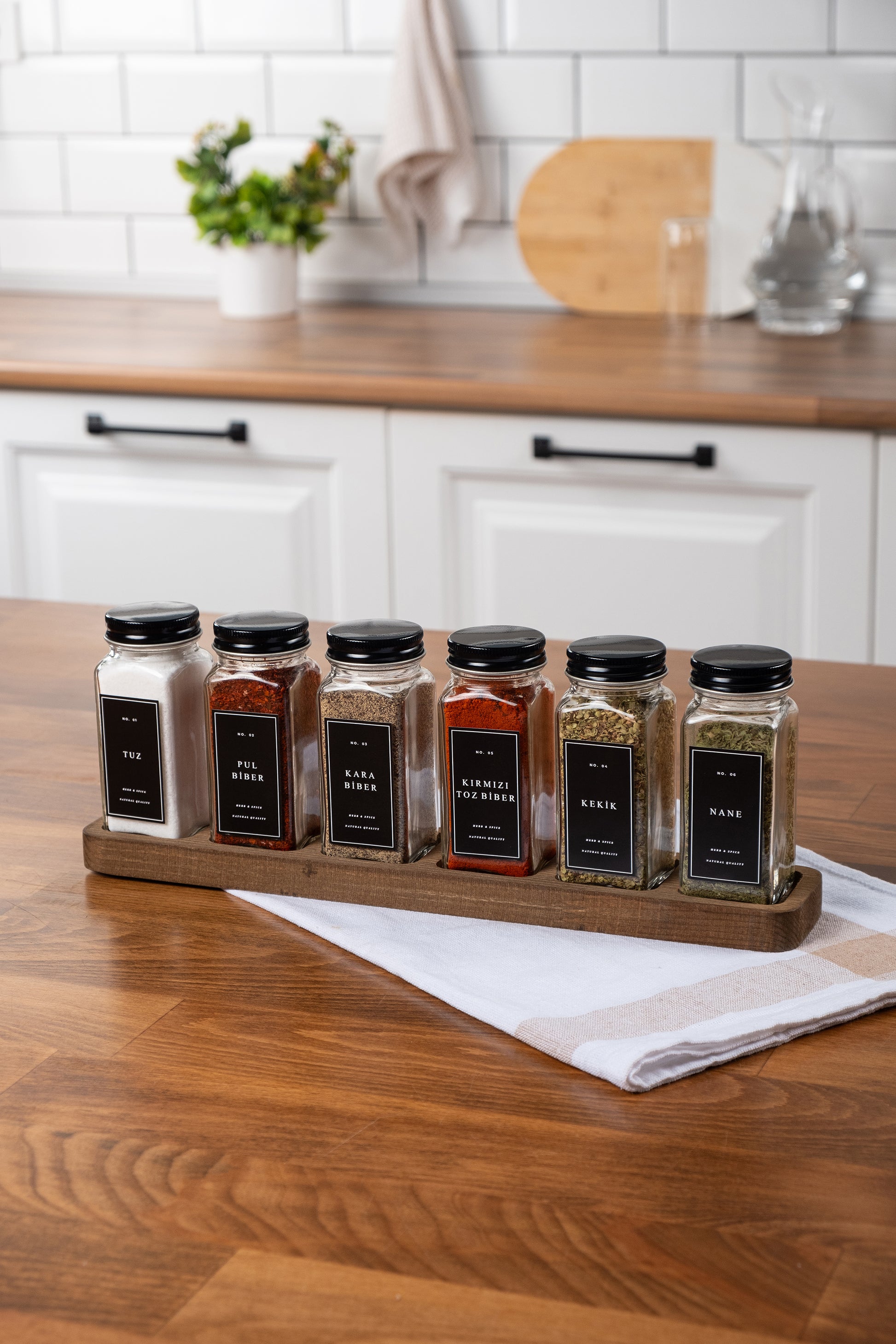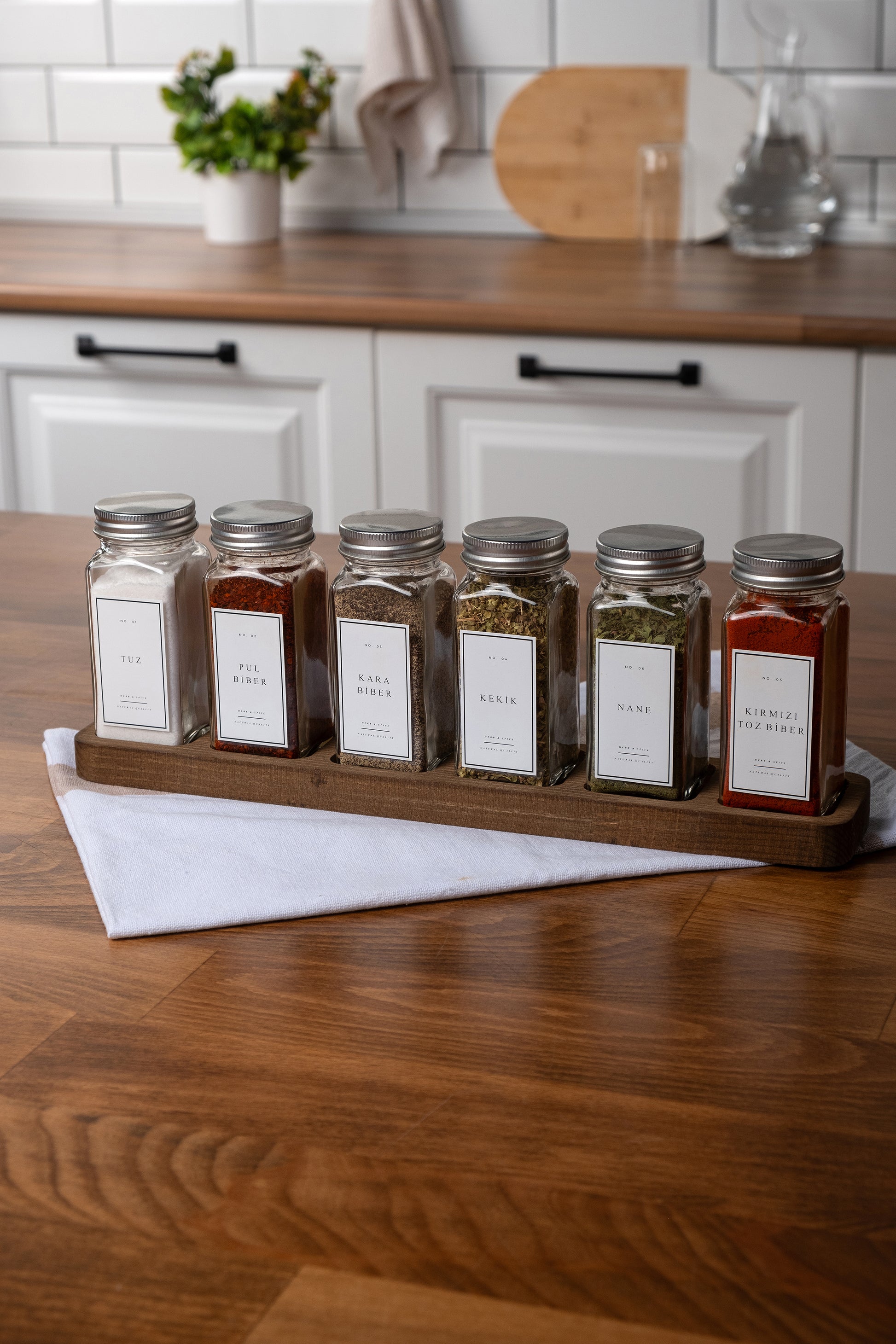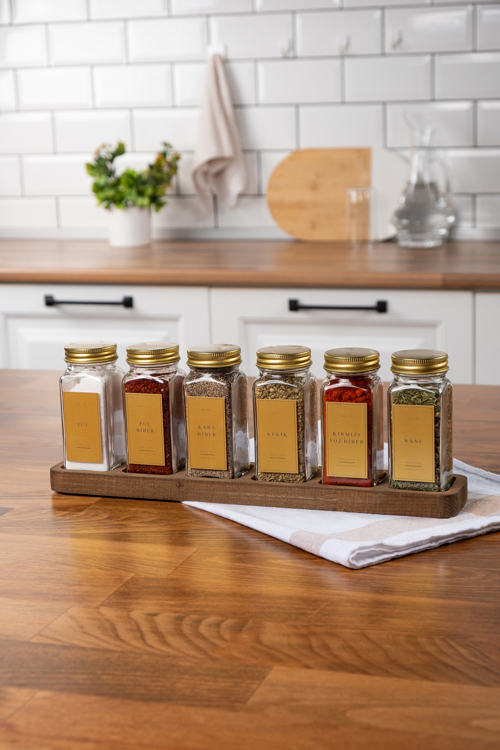 Paket İçeriği; 6 adet Baharatlık, 6 adet iç kapak, 6 adet dış kapak, 12 adet sudan etkilenmez etiket, 1 adet 6'lı ahşap stant,