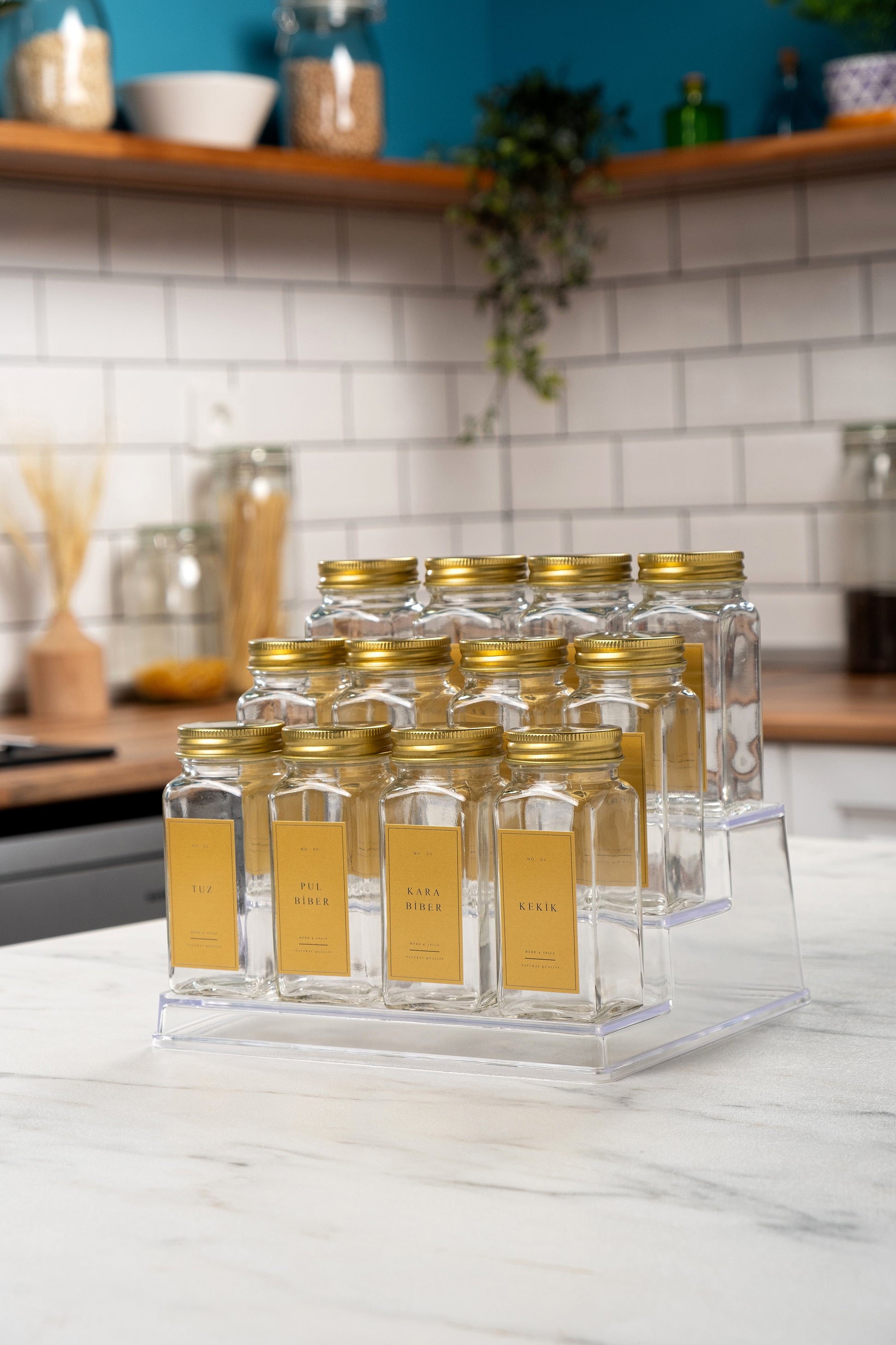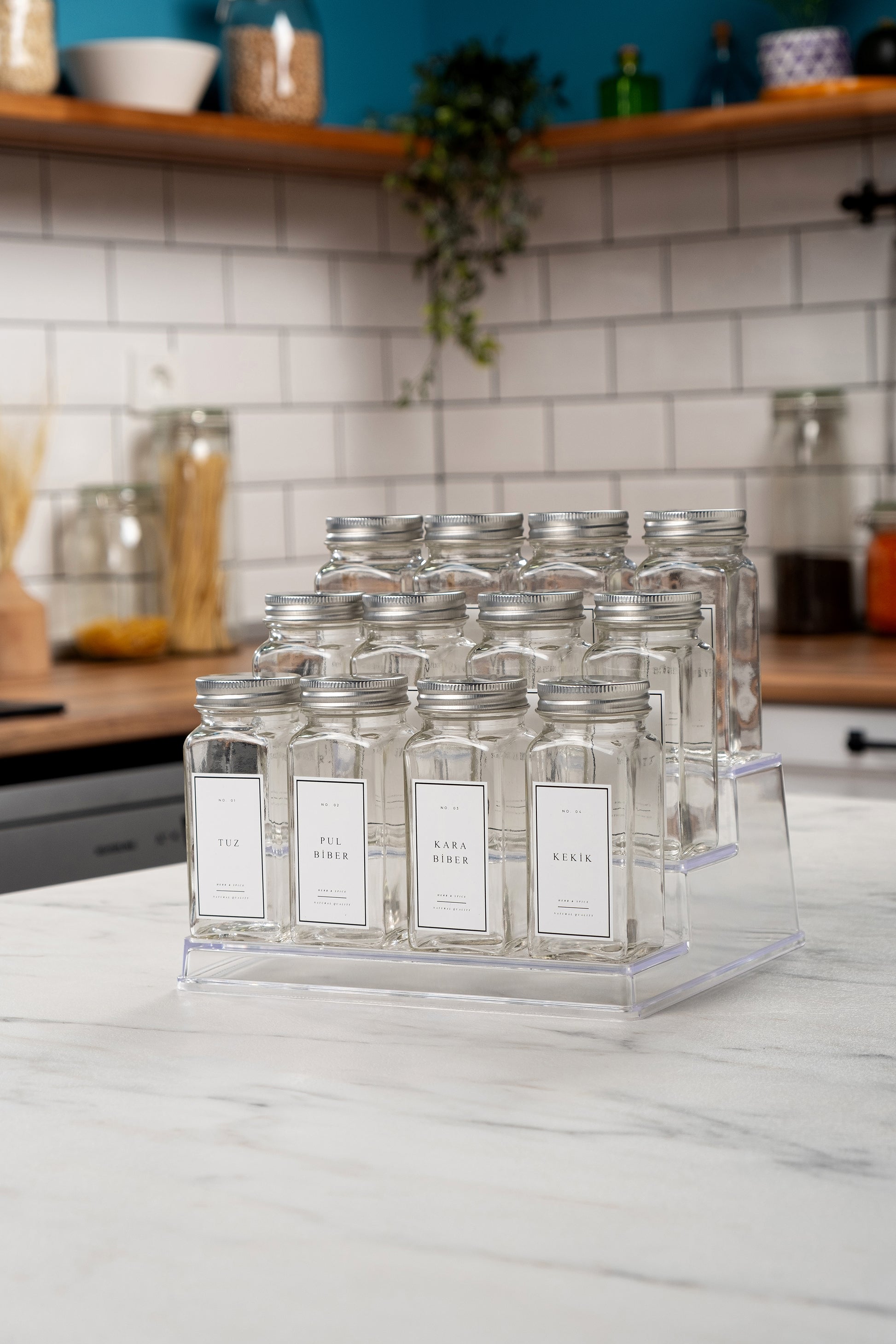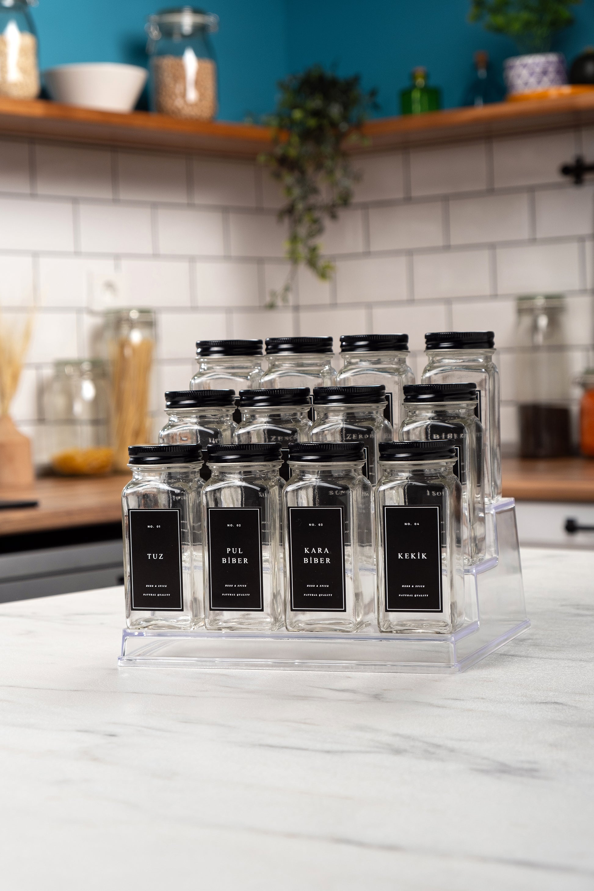Paket İçeriği; 12 adet Baharatlık, 12 adet iç kapak, 12 adet dış kapak, 18 adet sudan etkilenmez etiket, 1 adet merdiven stant,